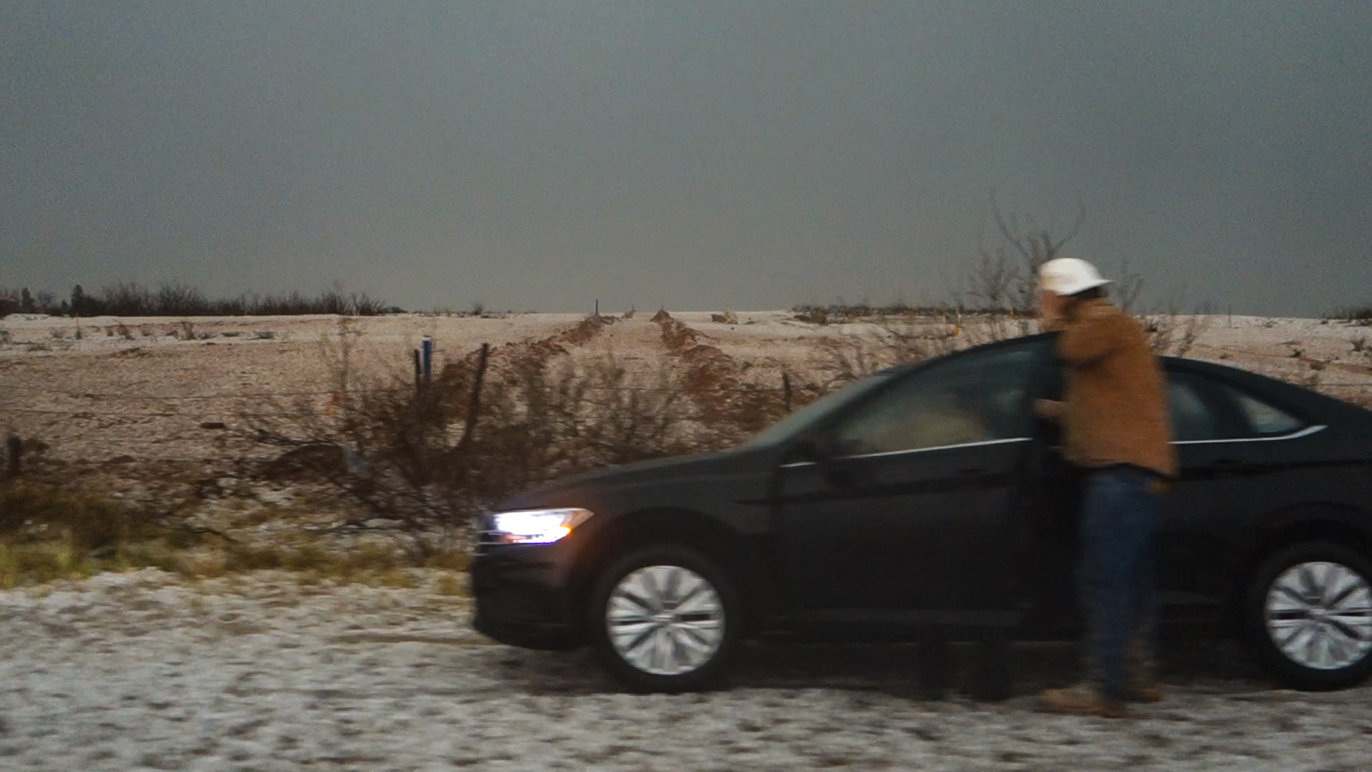 But almost as soon as we caught this nubby little funnel, it passed ahead of us and into the rain. Nickel hail soon followed, so we backtracked east towards Malaga. To our south, flanking line towers appeared to be consolidating into another base, but without better radar coverage I didn't have much situational awareness. At Hwy 285 we had a coin-flip choice: new base south or existing rotation north. Much to my hindsight chagrin, we chose north -- plunging further into a strengthening hail core hoping to catch another view of the funnel near Loving. On the outskirts of town, hail got large enough (ping pong balls) that I temporarily sought shelter under a random home's carport before continuing north. Along the highway, several inches of hail accumulated and a few cars had their back windows knocked out.