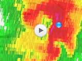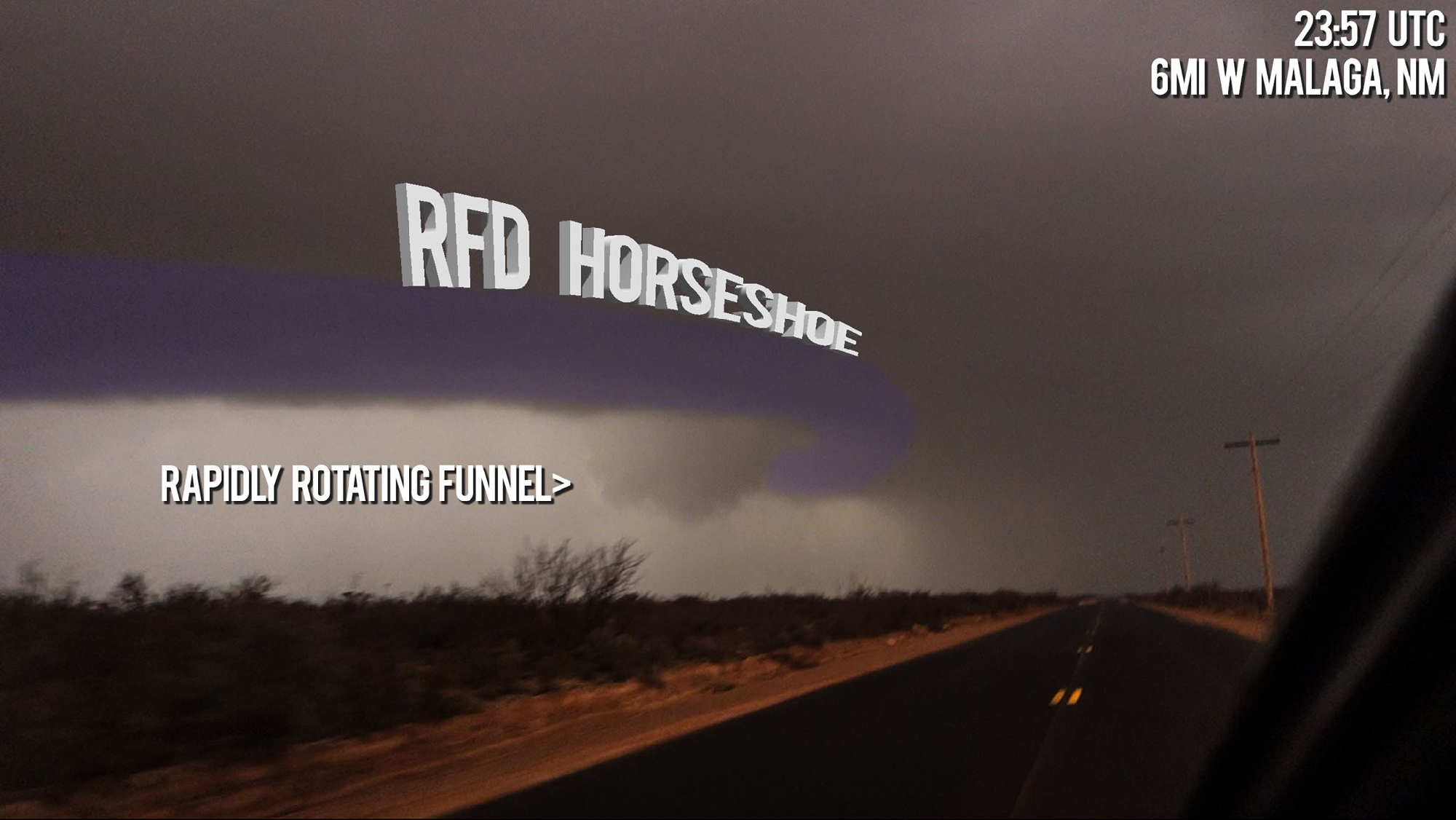 Hoping to get a view ASAP, we headed west on Hwy 720 directly towards the heart of the onrushing storm -- not sure exactly where the primary rotation was located. The day's ubiquitous, grey gloom was not yet completely gone, and now it was joined by staccato purple lightning flashes in the forward flank. By 5:55, we noted an RFD horseshoe arcing towards us with a tight lowering on the northern apex -- classic tornadic structure!