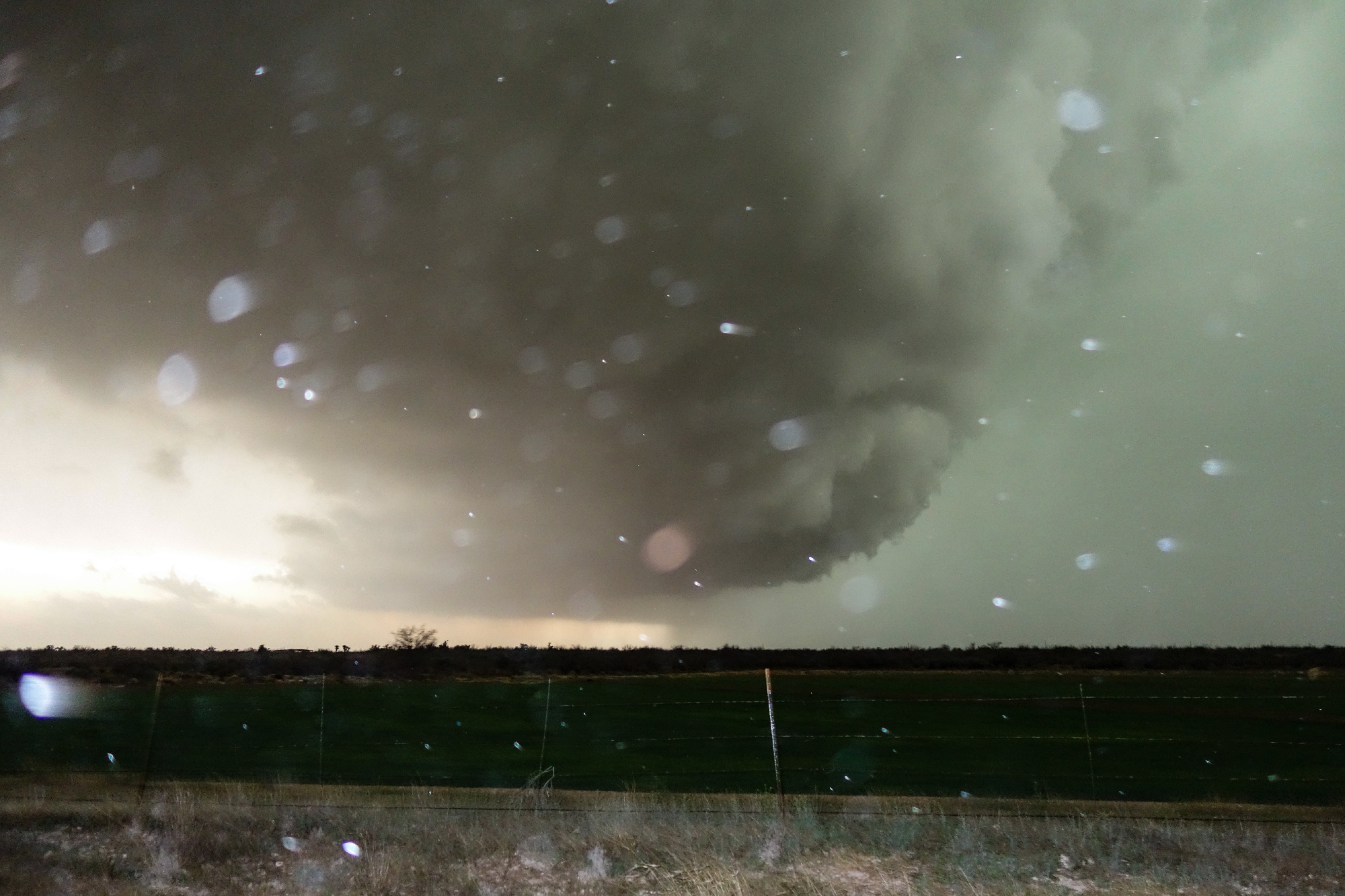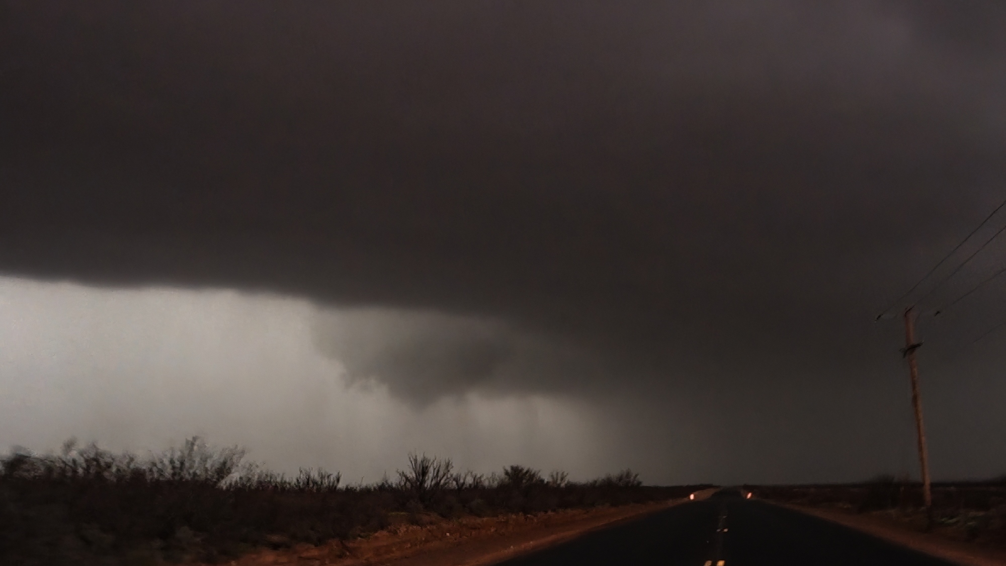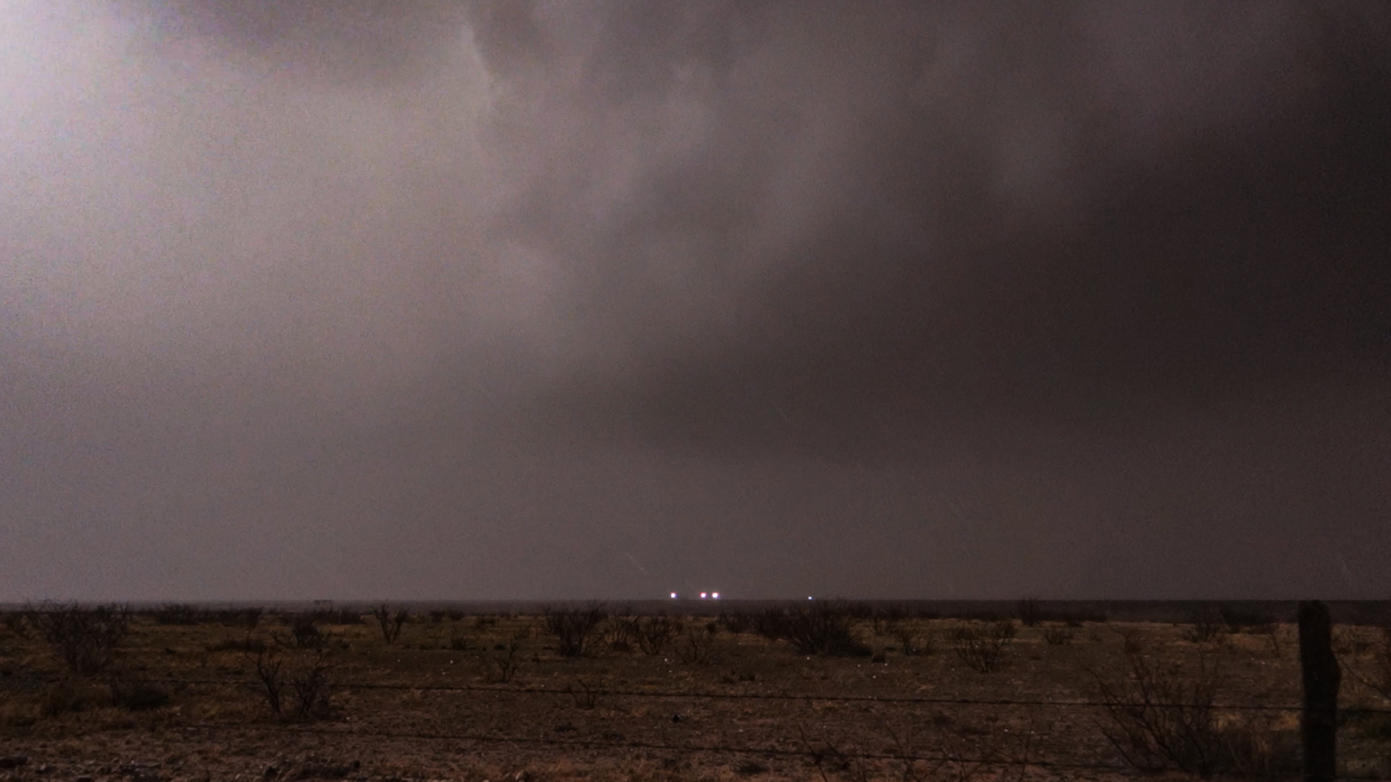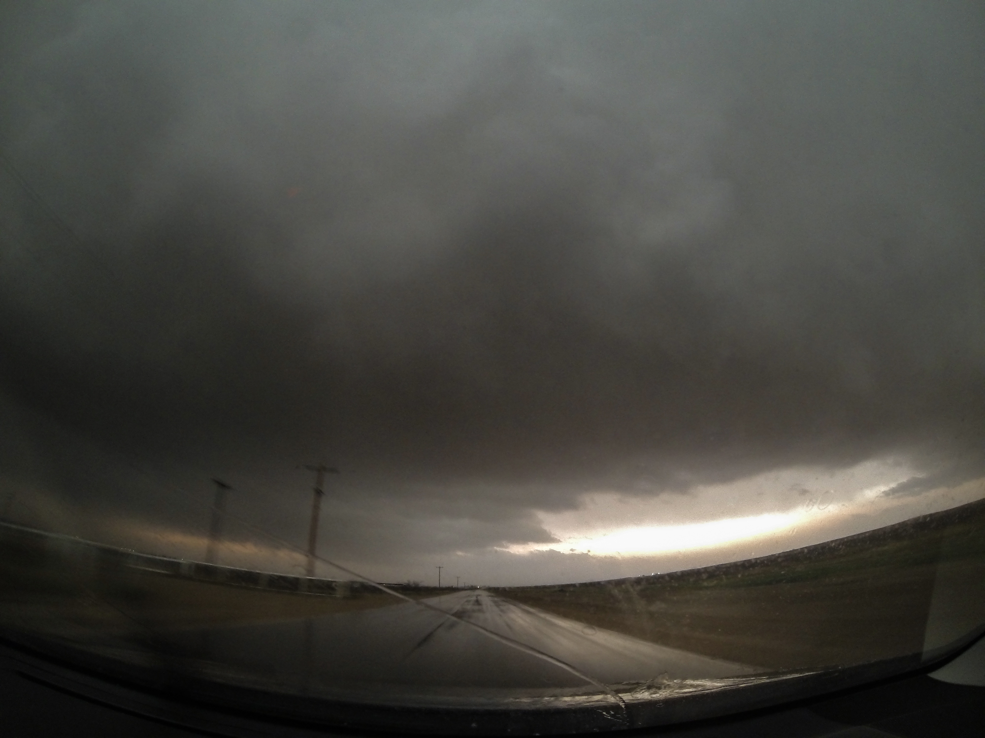 Far from the Cannon AFB and Midland radars, it was difficult to discern storm structure in the oncoming cell, apart from its embedded nature in the larger line and a hint of a comma curl. But at 5:40, Midland NWS issued of Tornado Warning headed directly for us! Perhaps this gloomy chase was about the change.