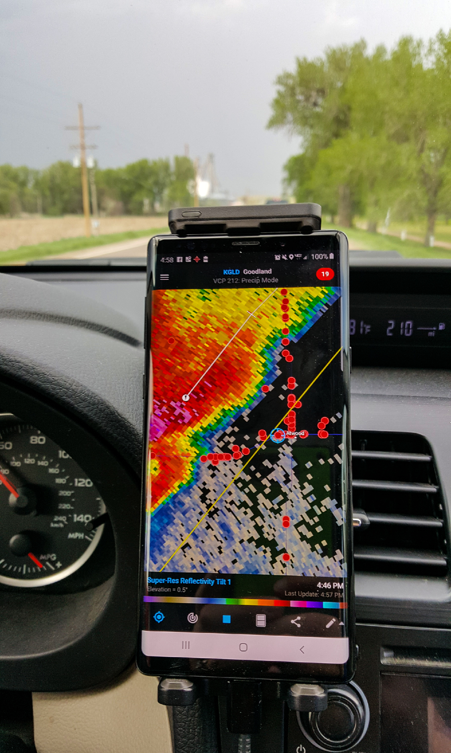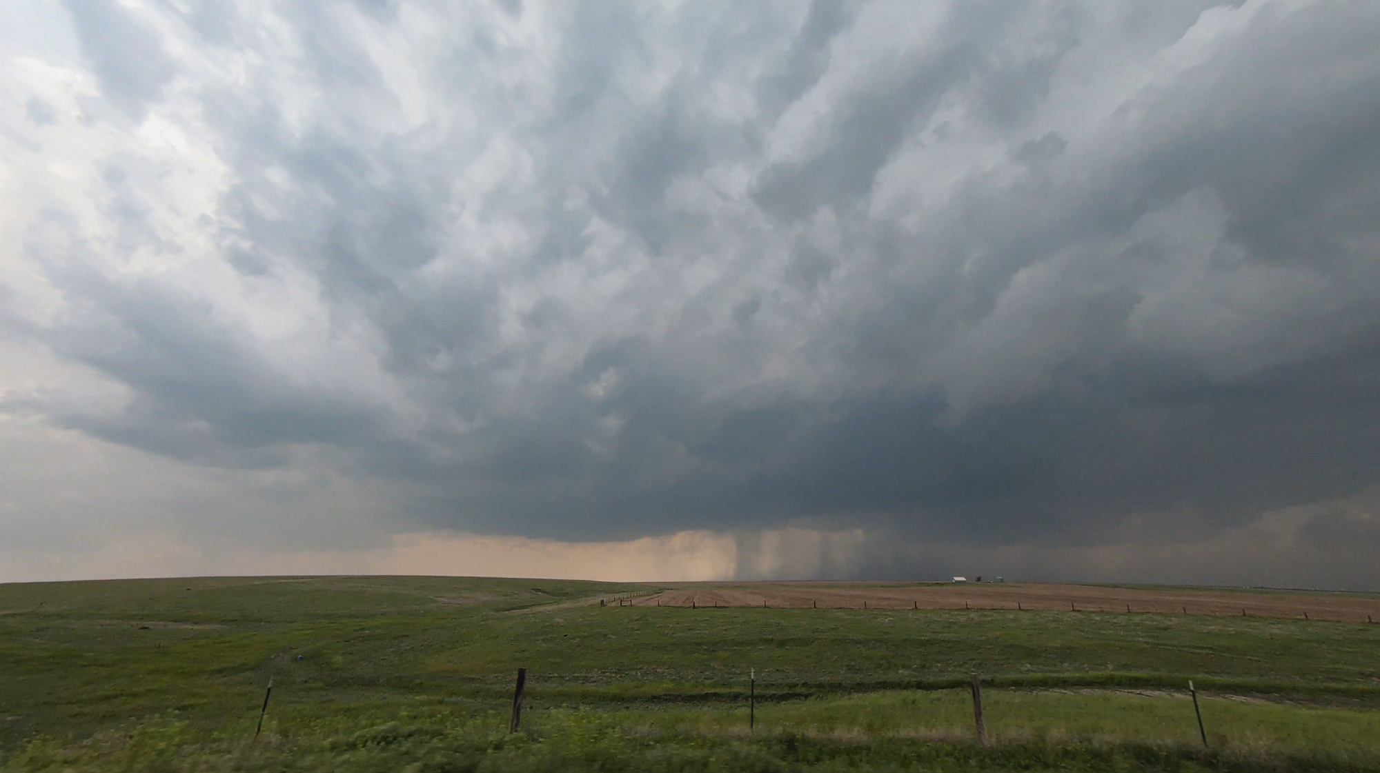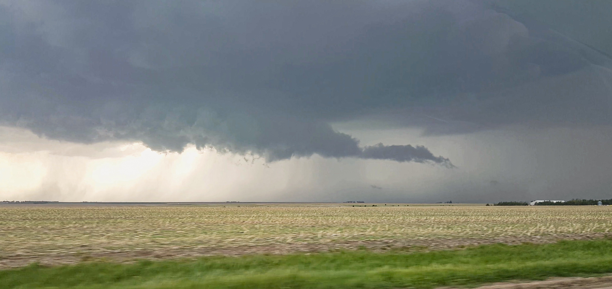 Around 4:30, our aggressive chase strategy was threatening to undo our good fortunes. Typical for me, I waited until the last minute to halt our slider timelapse, and by that point the strengthening supercell was already crossing the dirt road to our north. Slowed by the mud and small hail, we risked falling behind early and being out of position for the remainder of the chase. But thank goodness for Hwy36, whose beautiful E/W pavement allowed a crisp hook slice into Atwood, KS to get downstream.