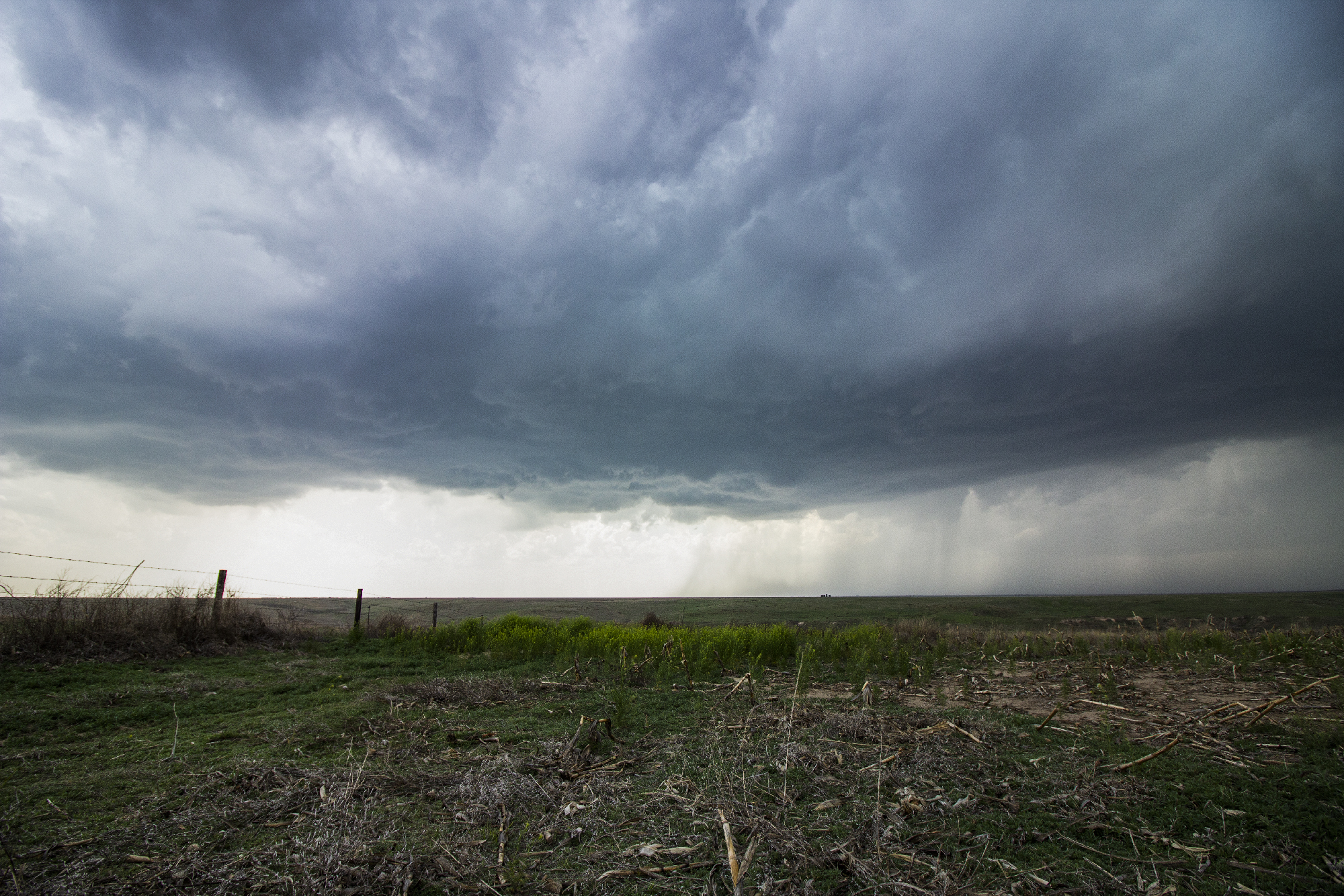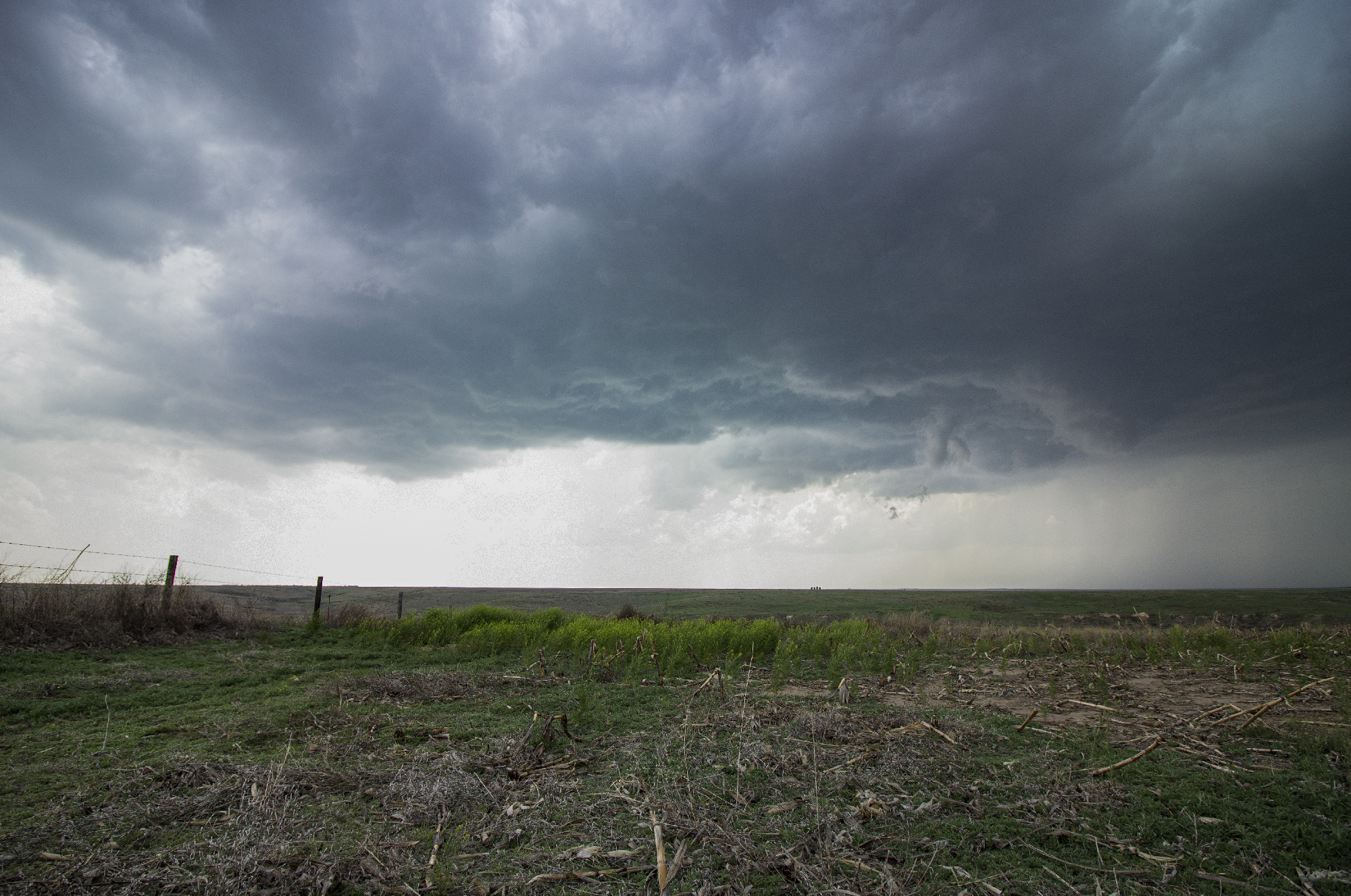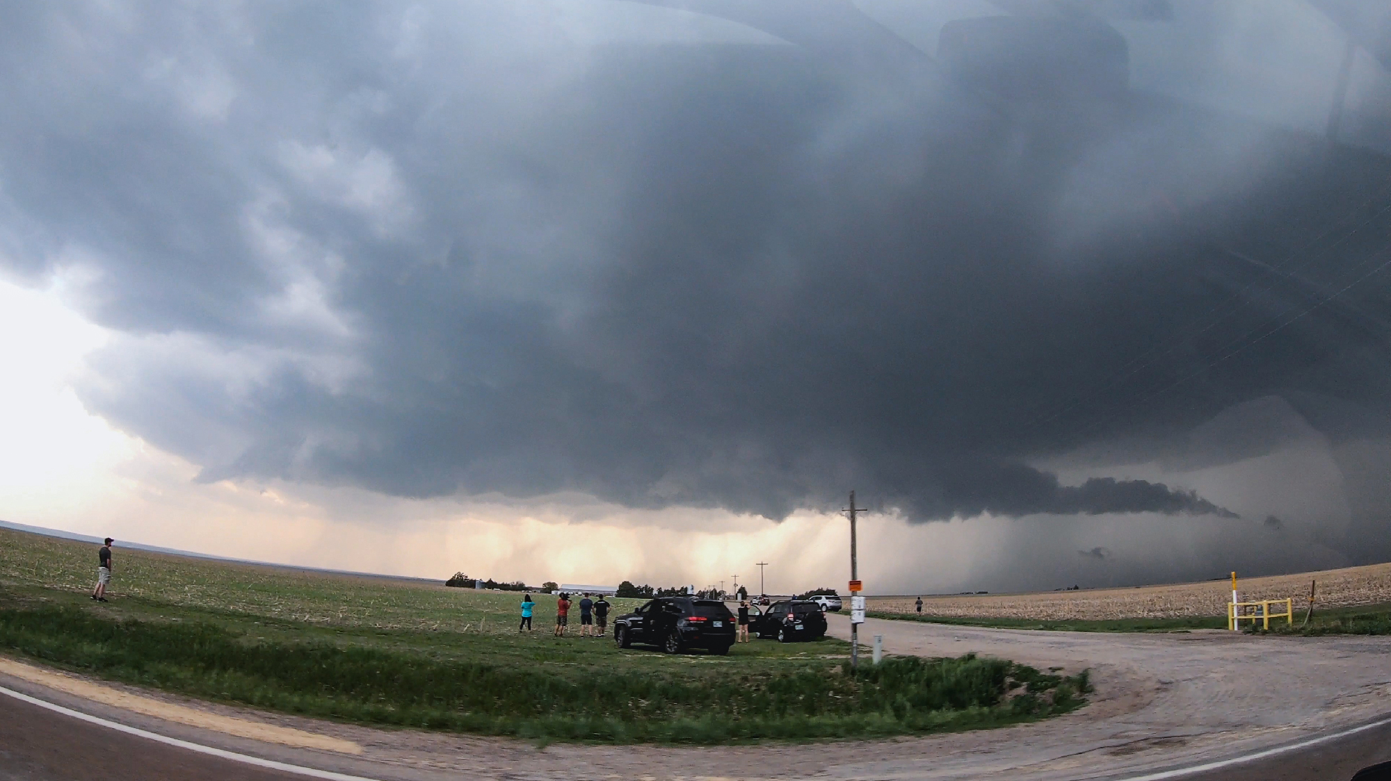 After having our early vantage point all to ourselves, it was jarring to suddenly enter the chaser hoard as we cruised north out of Atwood. All manner of decal-covered and hail-guarded vehicle watched to the west as our storm gathered a more ominous inflow tail and scuddy wallcloud. Despite the maturing structure, there was still more surging than wrapping motion, thus I felt safe getting a little further north well into the notch. We paused for only a couple minutes as ground-scraping scud closed on our position. But still no obvious focal point for rotation was apparent. By 510, the storm was once again crossing our highway. Time to venture out on the grid.