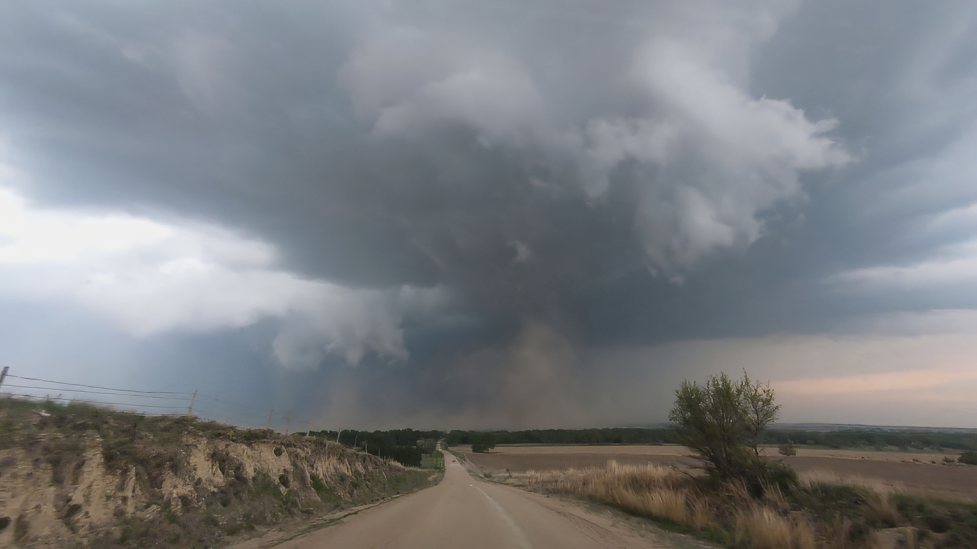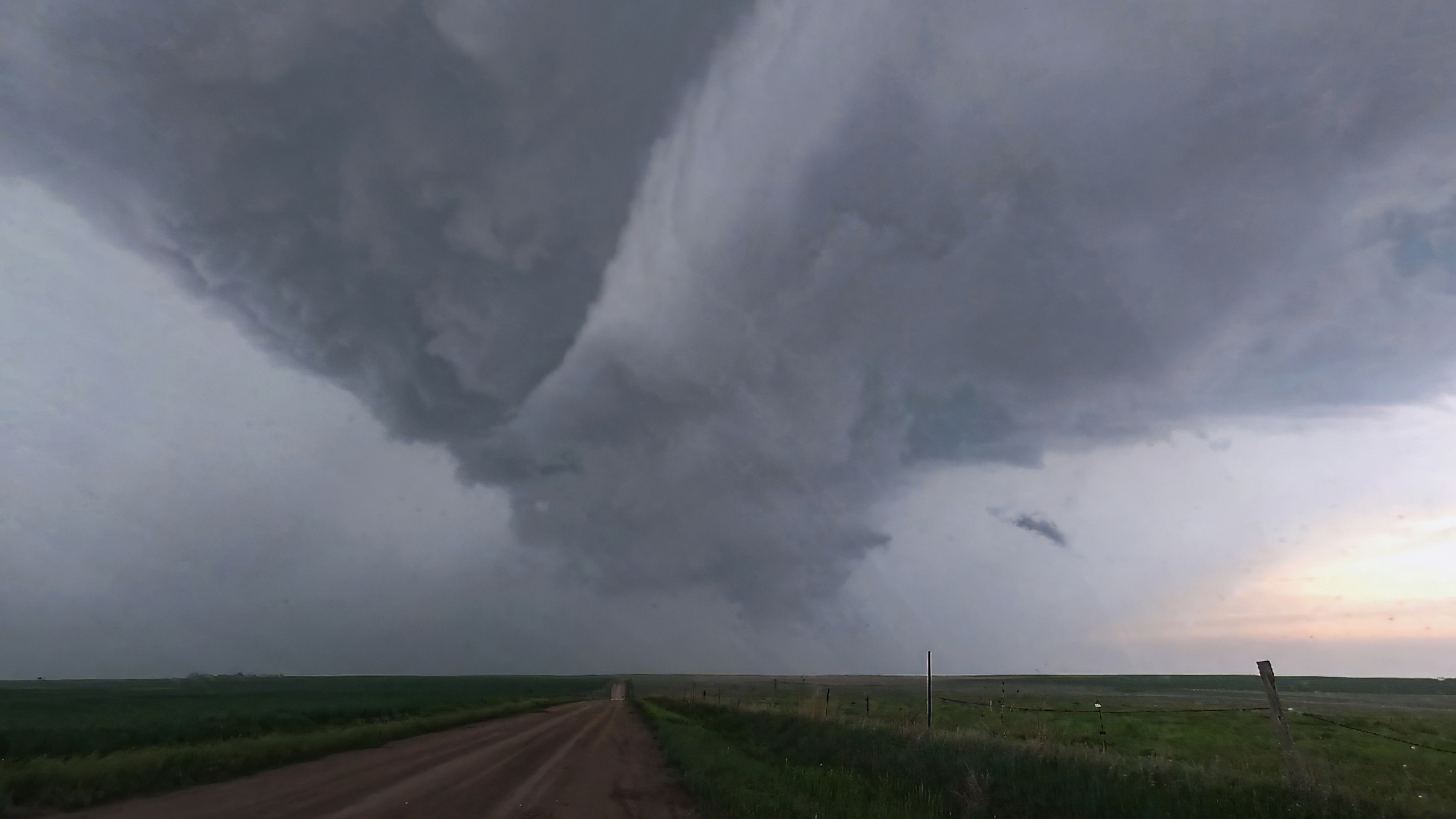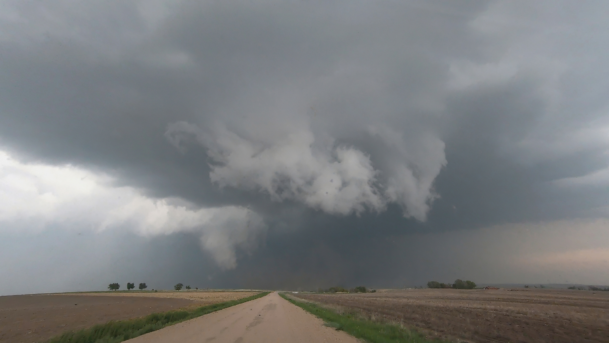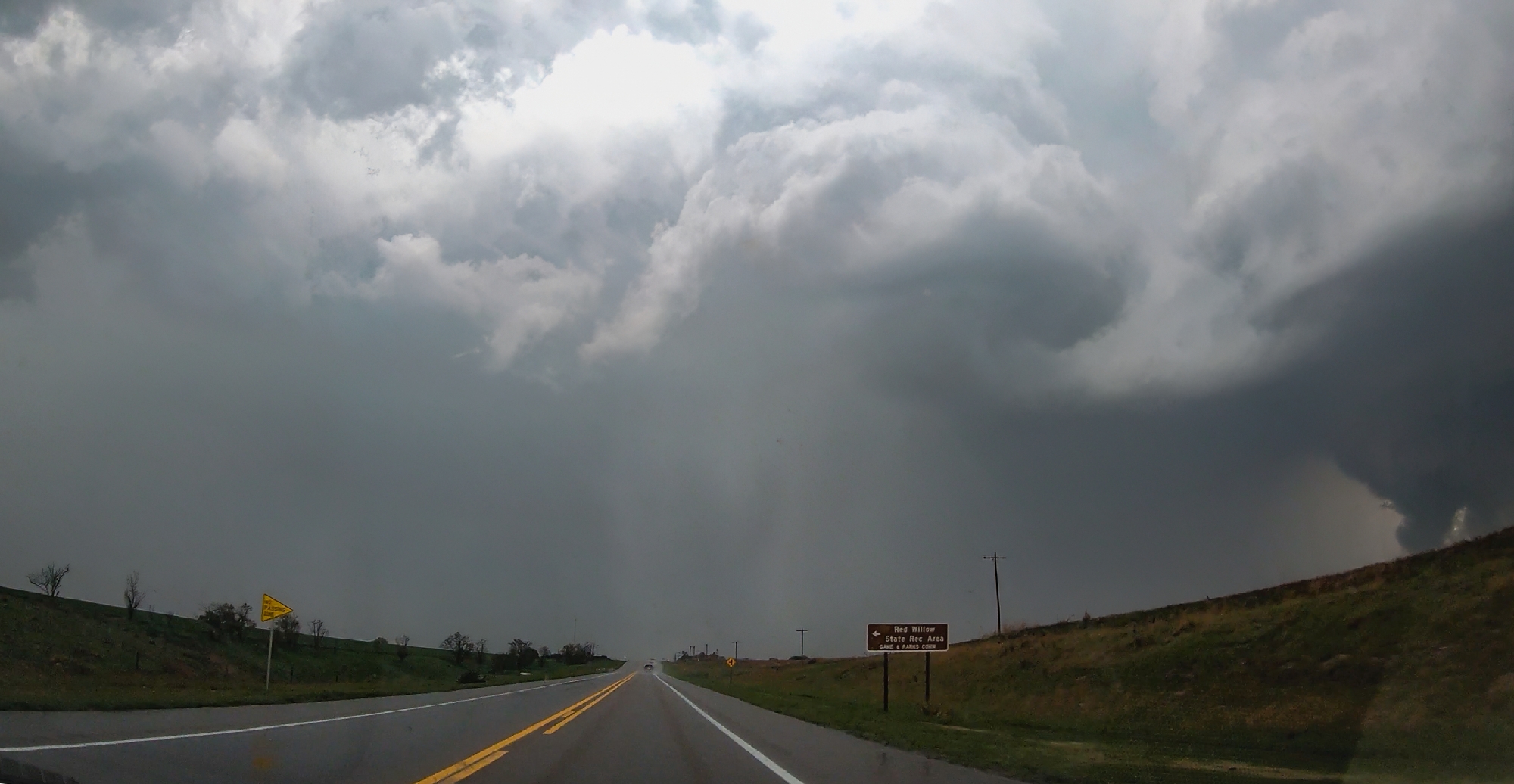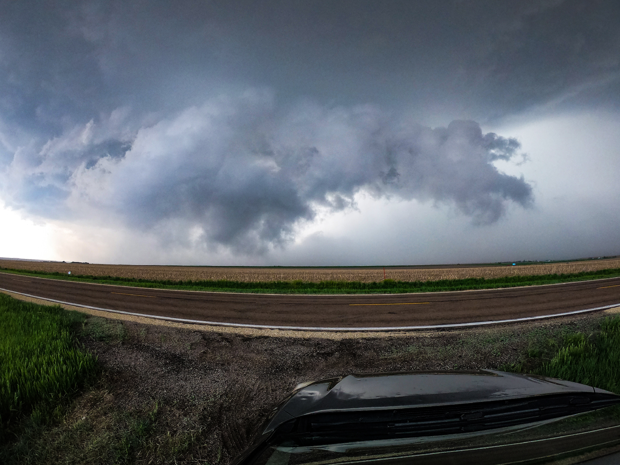 The baby funnels only fueled our appetite for something bigger, but the current cycle soon fell apart as we started losing the battle to out-flank with the storm. Yet once again, a clutch Hwy17 (not an intentional Half Life 2 reference I swear) helped us play catchup. By 5:45, we were trailing just a couple miles behind the storm as a vigorous new RFD cut began to arc into the base. This new surge formed a massive horseshoe with a huge cloud of dust fanning out underneath. Transient lowerings looked suspicious, but the show had not quite started yet. At precisely 5:56 we took a final jog north on Rd380. In a blur, we passed a weather balloon sounding launch as we pushed under the RFD arc. Then, just as we topped the final hill south of the Republican River, a sweeping view north into the jaws of the meso, there she was. A dust column under a small laminar cone standing out amongst the more ragged RFD scud tags. WE HAD TORNADOGENESIS.