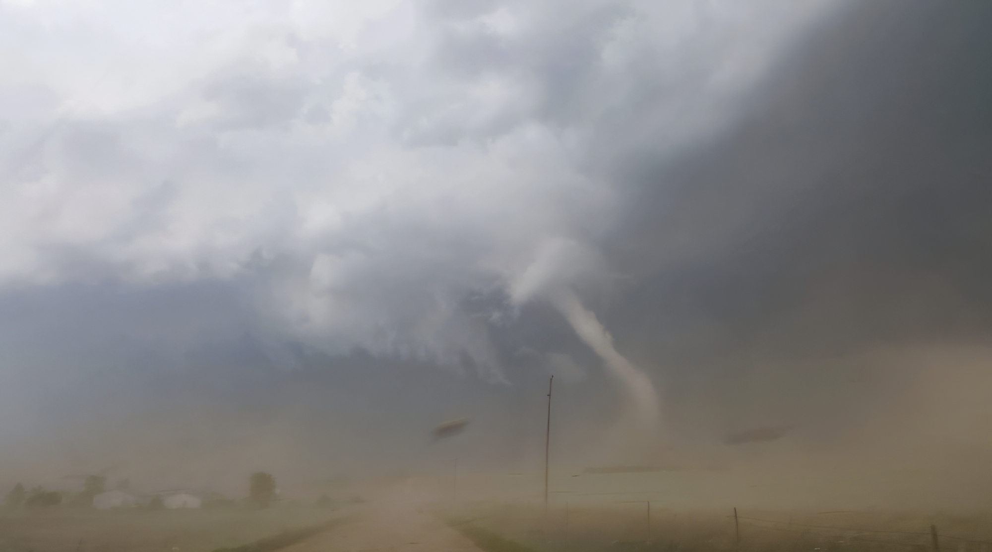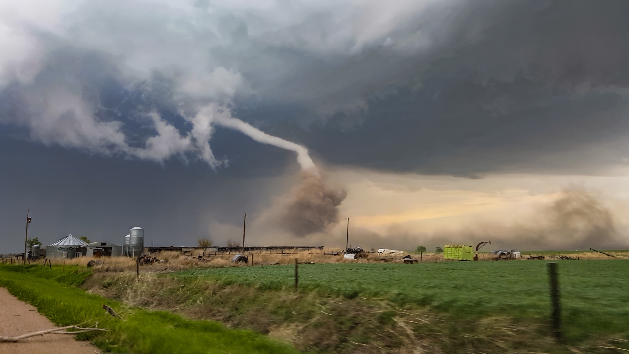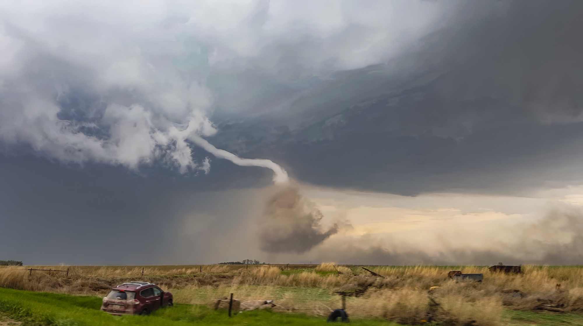 Now the task was to get as close as safely possible. At the Rd380 / US34 intersection, we bounced across the roughest railroad crossing ever. "Did we break our car??" Toni asked. But no, the pursuit was still on. RFD broadsided the Crosstrek we continued north, the elongating cone dead ahead. In all the blowing dust, scale became tricky to judge. Was the tornado only 100 yards ahead or was it still a mile up the road?? Finally, we simultaneously climbed a small hill and broke into a slightly calmer zone closer to the tornado, and it was at that moment Toni captured the picture of the day -- the fully-condensed, kinked rope with a dramatic, churning dust cloud at its base. It's one of the top views we've ever had, and in that instant, I might have shed a single tear (but it was probably from all the dust we'd just driven through).