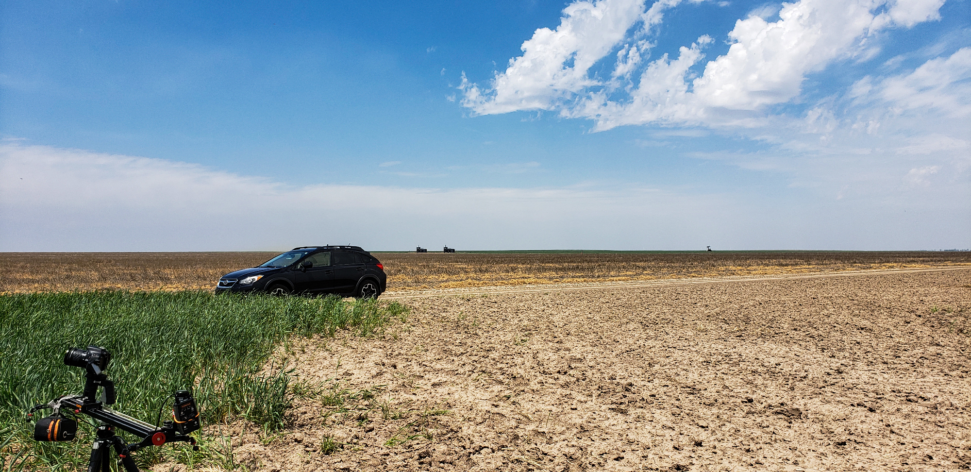 It might seem weird that chasers often sing the praises of morning fog. But it's true; many outstanding tornado days have started with dense early fog. This low cloud layer has a tendency to prevent temperatures from getting too hot, thus forestalling T/Td spread from getting too wide, thus keeping storm bases from growing too high, thus making tornadoes more likely to form. Obvious right? Well, I was certainly enthusiastic as we crossed north of Scott City and into some tasty, moist fog. Muggy air streamed NNW towards our target as we stopped occasionally between Scott City and Oakley to exercise some B-roll drone flights and slide rail lapses.