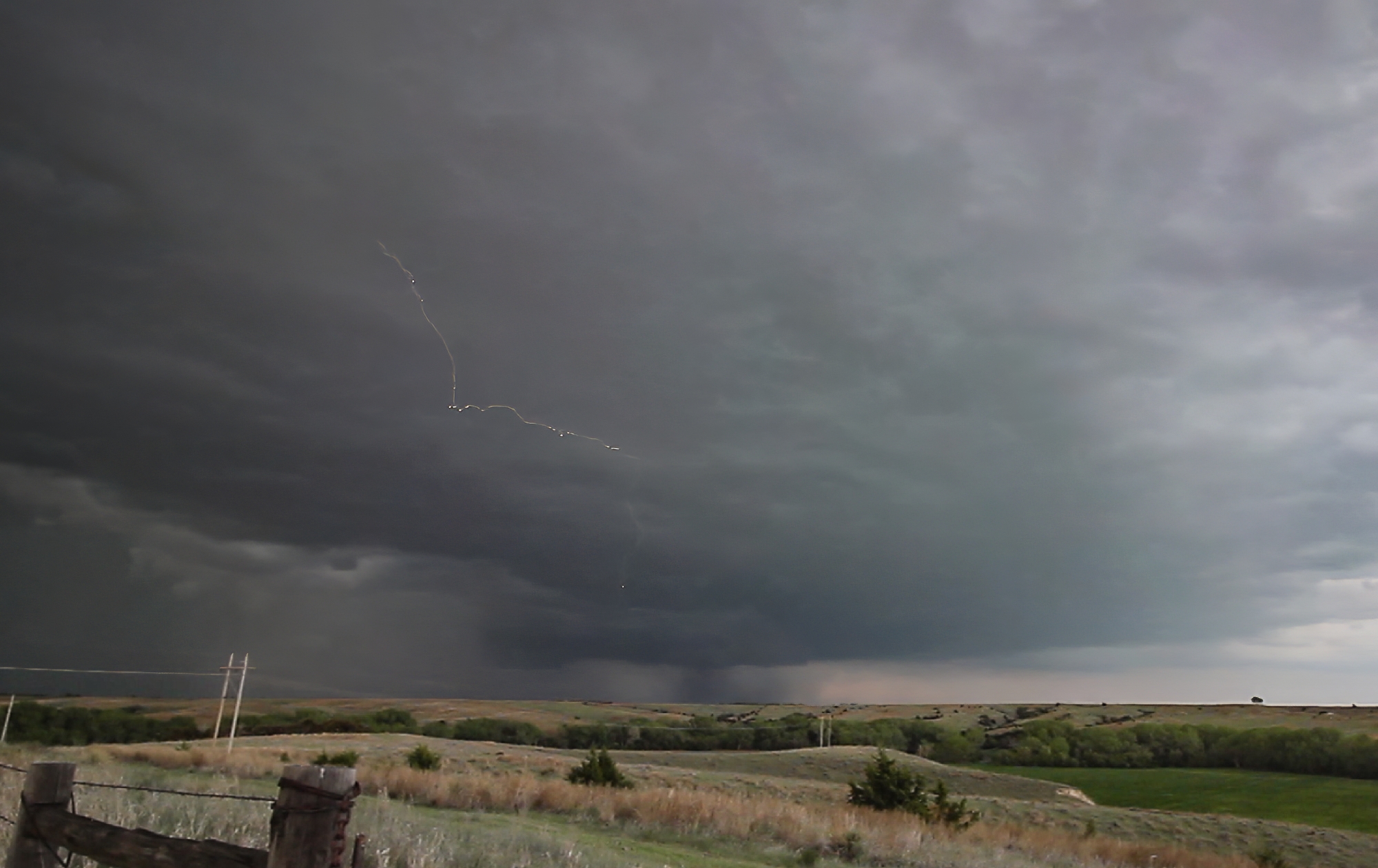 6:08 - 7:10 PM CDT: The supercell began a new cycle almost immediately, and at 6:15 we noted a new lowering to our northeast from our vantage on Hwy83. Likely if we'd hung back, we might have seen the brief tornado on this cycle, but I closed in too tight and we lost visibility in the RFD precip and hills. From there it was another 20-mile grid hop northeast as we again played keep-up with the storm. Even though we were approaching the 7-o-clock magic hour (classic for the ramping low level jet that enhances hodographs and maximizes tornado chances), our storm took on an elevated, featureless base with little promise of an imminent tor.