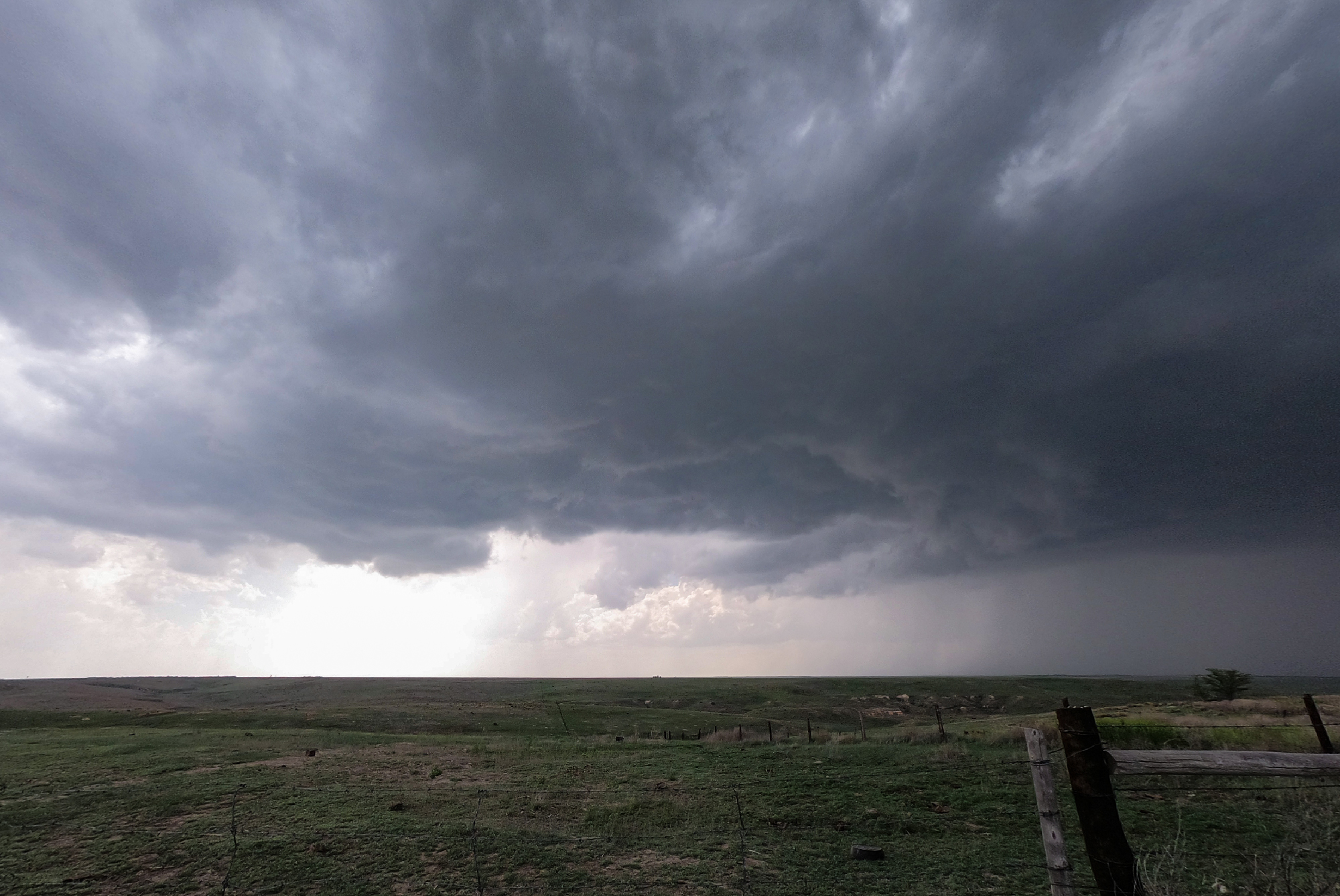 3:35 - 5:15 PM CDT: As often lamented on this blog, early storm appearance is rarely anything to write home about. But today actually held a pleasant surprise: pressing north out of Brewster, KS and getting our first look at the young severe storm, I was charmingly delighted to see a dark rain-free base and even a proto-vault in the forward flank. Stopping for the first storm lapse of the day, a couple curious horses crept up wondering what we found so interesting. And interest was indeed rising, as by 4:20 PM the first signs of a baby RFD began carving a small arc into the back of the base. Even some tentative rising scud indicated a first failed attempt at tornadogenesis. At this rate, surely we'd be seeing tornadoes within the hour, right?