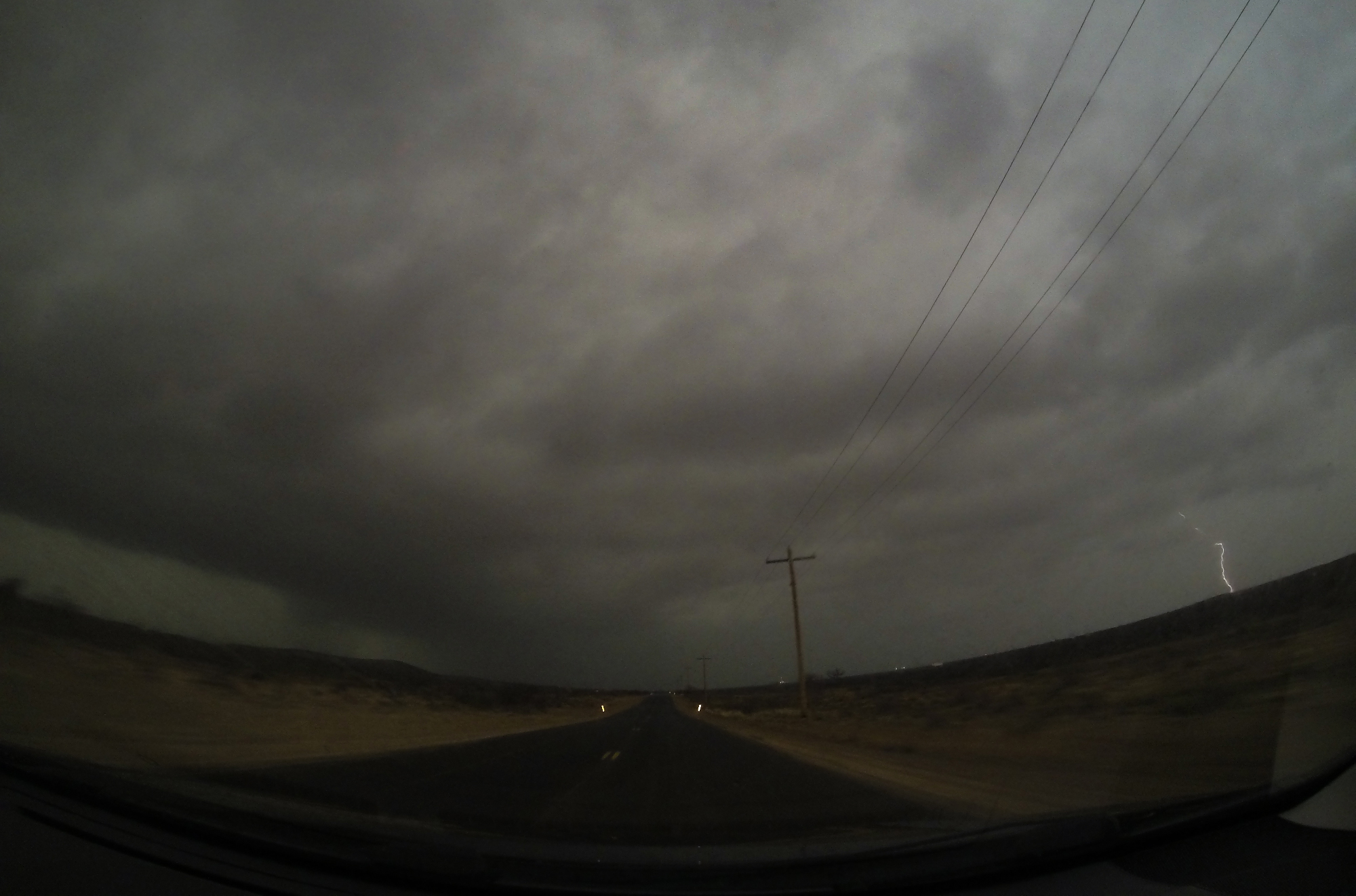 5:00 - 6:20 PM MDT: Nevertheless, we persisted south towards the next storm coming out of Texas towards Carlsbad. We looped around the SW side of town but still caught some bad rush-hour traffic -- likely a combo of locals and oil trucks. Finally, by 5:35 we made it through Carlsbad south on Hwy 285 towards Loving -- most of the fog and stratus having burned off leaving a view of an approaching dark cloud bank to our southwest.