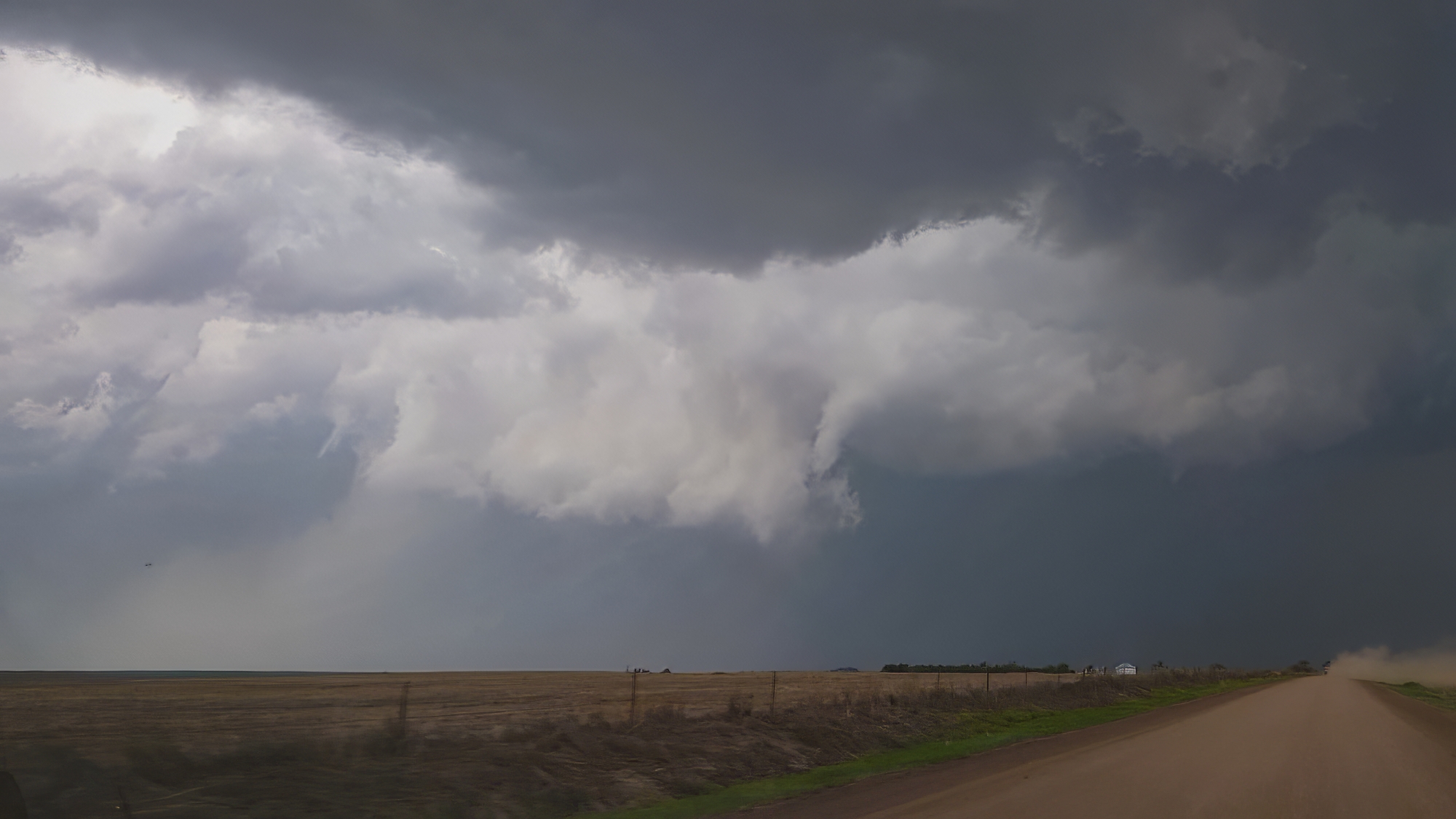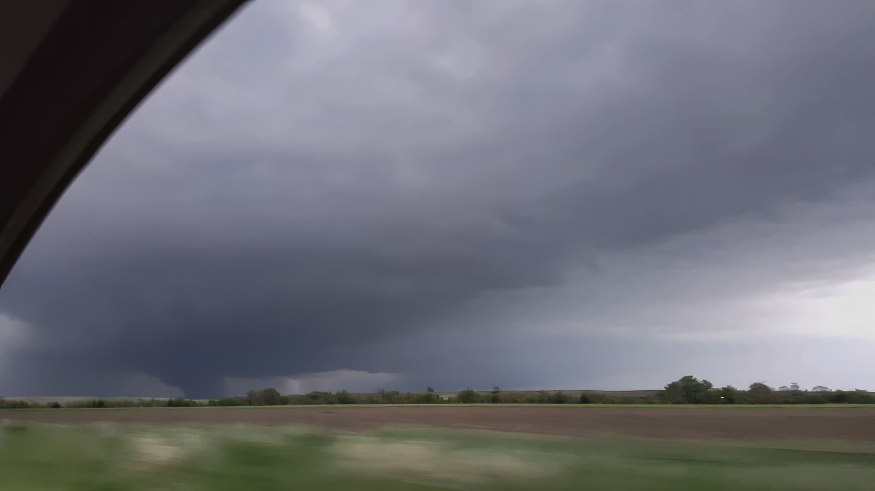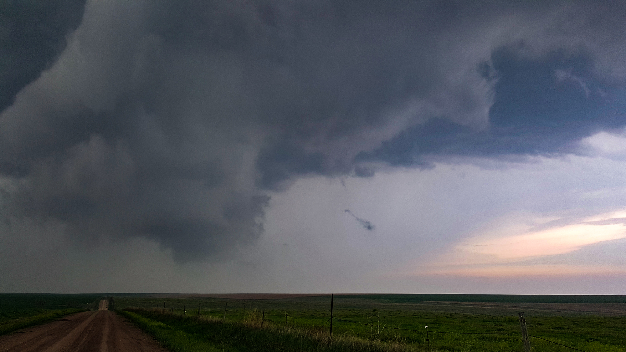 Around 4:30, our aggressive chase strategy was threatening to undo our good fortunes. Typical for me, I waited until the last minute to halt our slider timelapse, and by that point the strengthening supercell was already crossing the dirt road to our north. Slowed by the mud and small hail, we risked falling behind early and being out of position for the remainder of the chase. But thank goodness for Hwy36, whose beautiful E/W pavement allowed a crisp hook slice into Atwood, KS to get downstream.