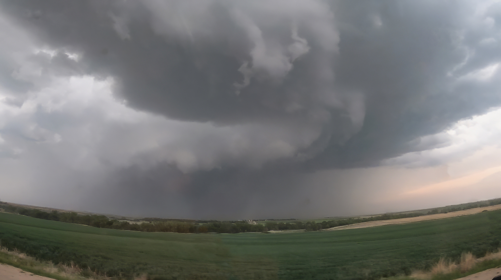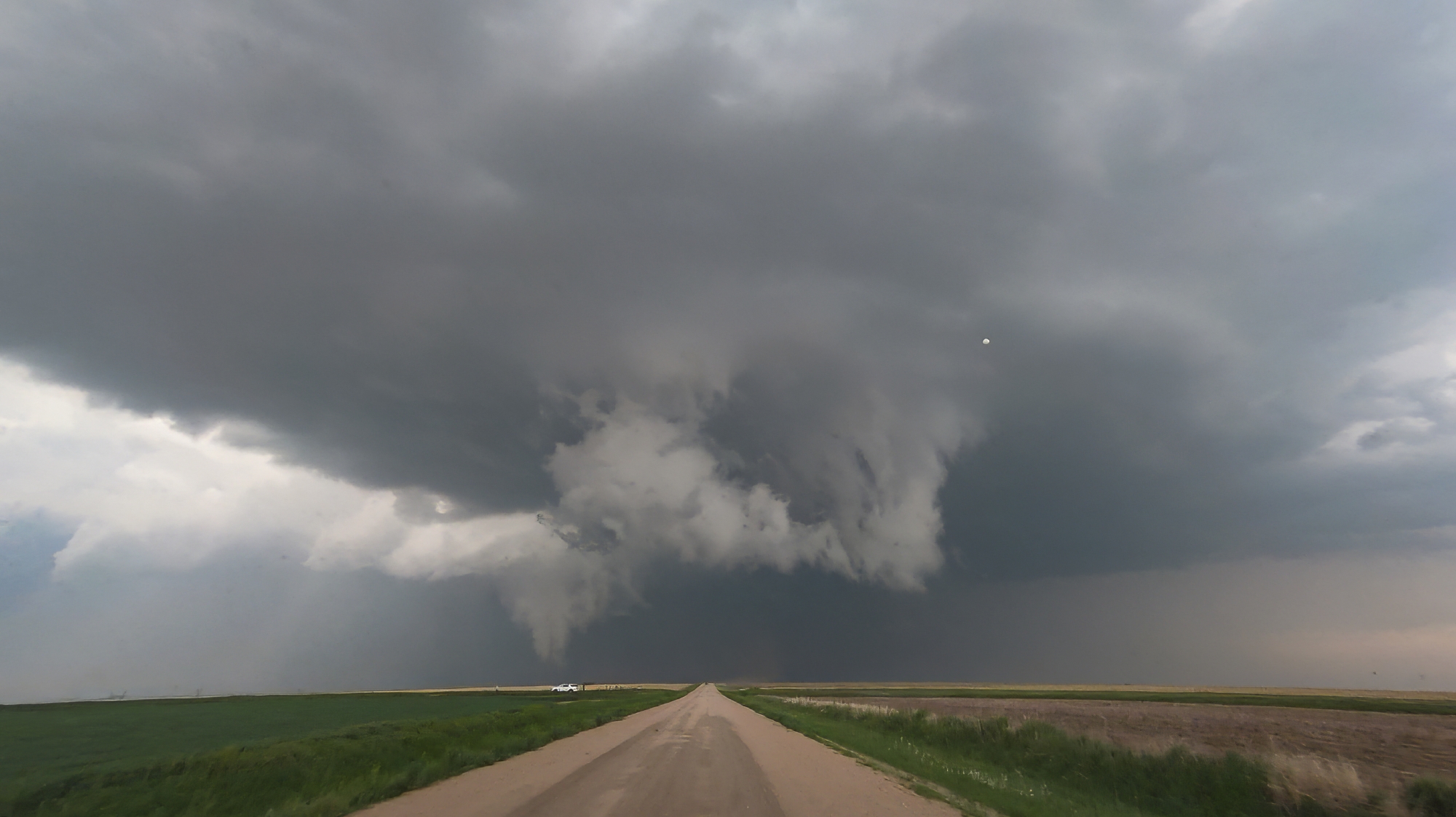 The baby funnels only fueled our appetite for something bigger, but the current cycle soon fell apart as we started losing the battle to out-flank with the storm. Yet once again, a clutch Hwy17 (not an intentional Half Life 2 reference I swear) helped us play catchup. By 5:45, we were trailing just a couple miles behind the storm as a vigorous new RFD cut began to arc into the base. This new surge formed a massive horseshoe with a huge cloud of dust fanning out underneath. Transient lowerings looked suspicious, but the show had not quite started yet. At precisely 5:56 we took a final jog north on Rd380. In a blur, we passed a weather balloon sounding launch as we pushed under the RFD arc. Then, just as we topped the final hill south of the Republican River, a sweeping view north into the jaws of the meso, there she was. A dust column under a small laminar cone standing out amongst the more ragged RFD scud tags. WE HAD TORNADOGENESIS.