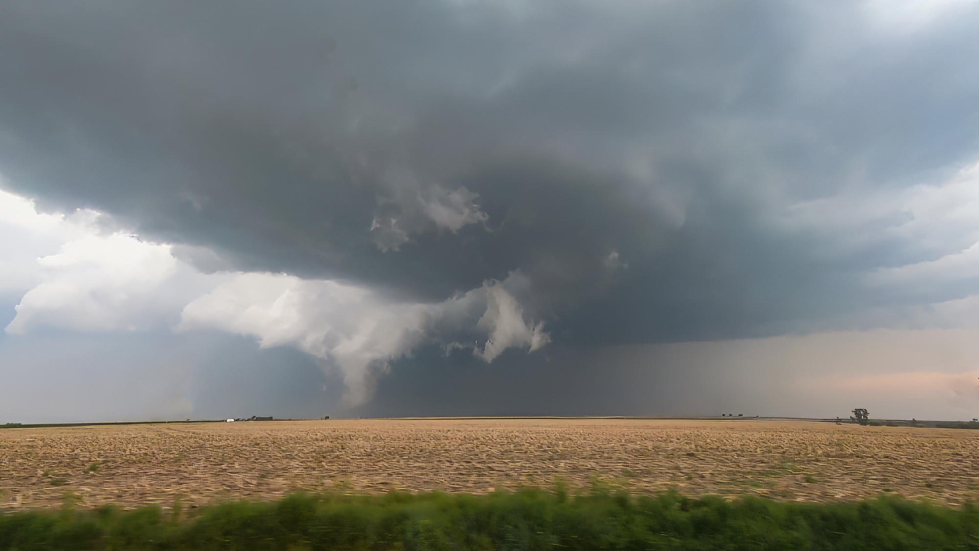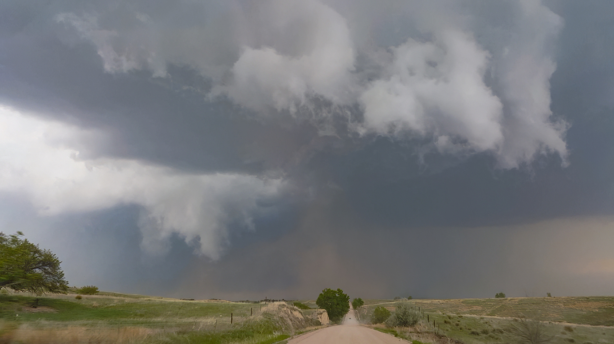 We made our way north on another dirt road into Farnam, NE -- along the way monitoring the trailing supercell just to our west. We pulled into Farnam just minutes ahead of the hook, but I didn't feel too threatened by the impending precip because we had a good escape route east on Hwy23. At least, I THOUGHT we had a safe escape. Only seconds after turning east, we met a traffic jam ahead. Apparently, the lead supercell dropped another tor just after Stockville, blocking our path with downed powerlines. Suddenly we were trapped between the onrushing hook and a closed road. Seeking a quick alternate route, I jogged north onto the grid looking for a way east. But the first grid road was also blocked. By this point the hook was overtaking us, and while I didn't see a big tornado on the ground, we were not in control of the situation. Then suddenly, as we were slowing working along a 3rd grid option, a small vortex appeared in the road 20 feet in front of us. And before we even knew what was happening, the small vortex rushed directly west towards us and impacted the vehicle. Now granted, this thing only had about 50-60 MPH winds, so it barely rocked the car. But it was at that moment Toni and I both realized how carelessly we'd treated the situation.