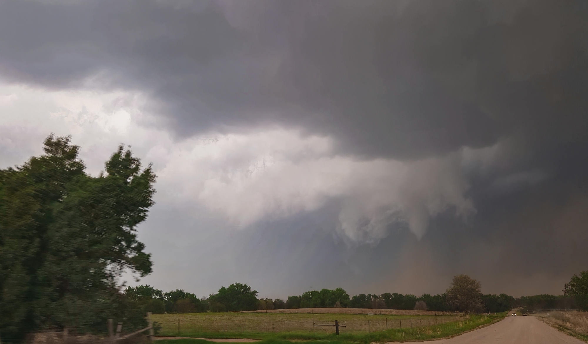 After having our early vantage point all to ourselves, it was jarring to suddenly enter the chaser hoard as we cruised north out of Atwood. All manner of decal-covered and hail-guarded vehicle watched to the west as our storm gathered a more ominous inflow tail and scuddy wallcloud. Despite the maturing structure, there was still more surging than wrapping motion, thus I felt safe getting a little further north well into the notch. We paused for only a couple minutes as ground-scraping scud closed on our position. But still no obvious focal point for rotation was apparent. By 510, the storm was once again crossing our highway. Time to venture out on the grid.