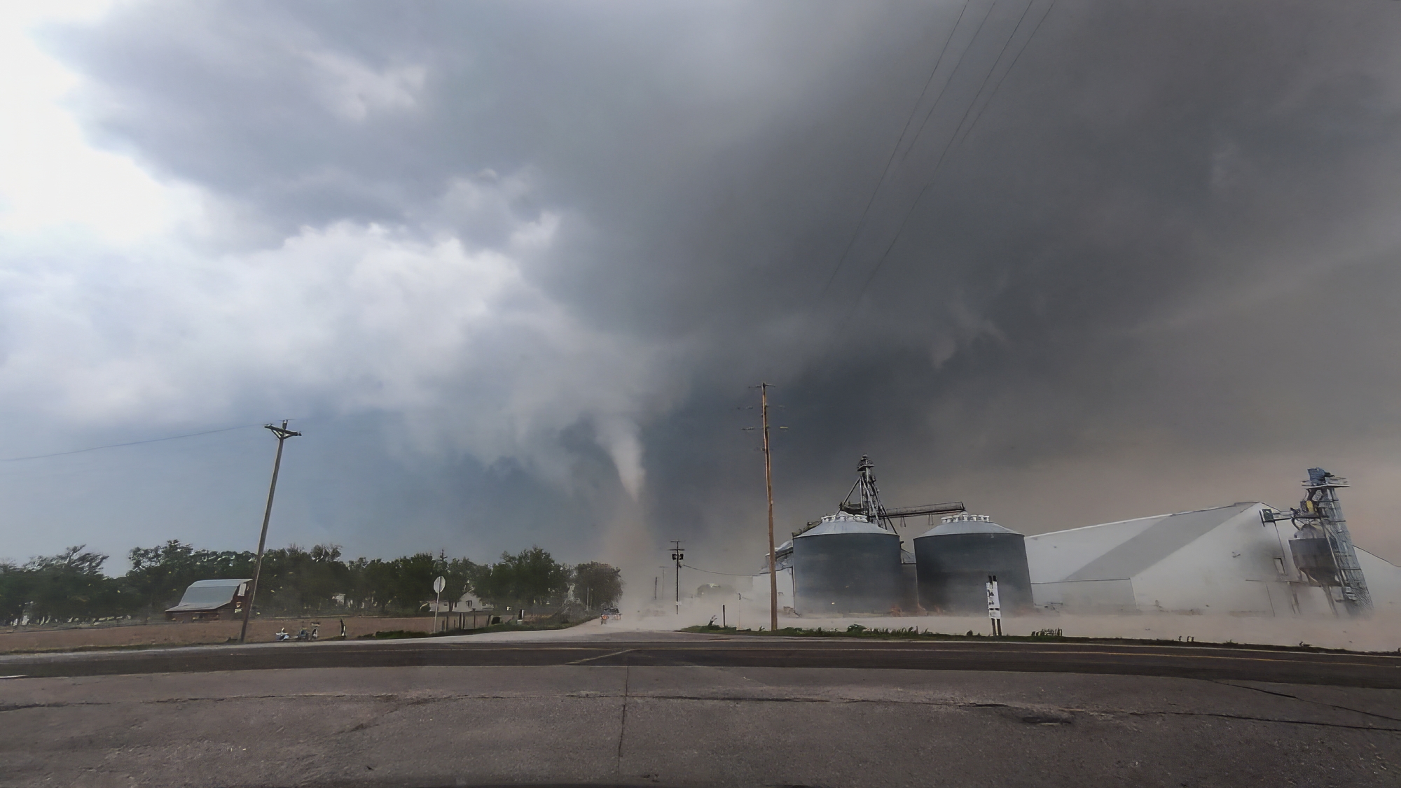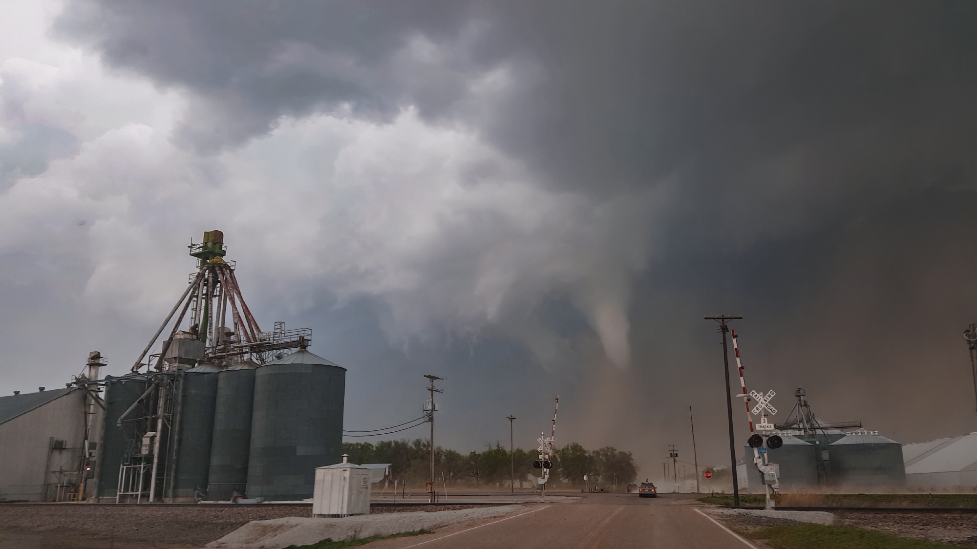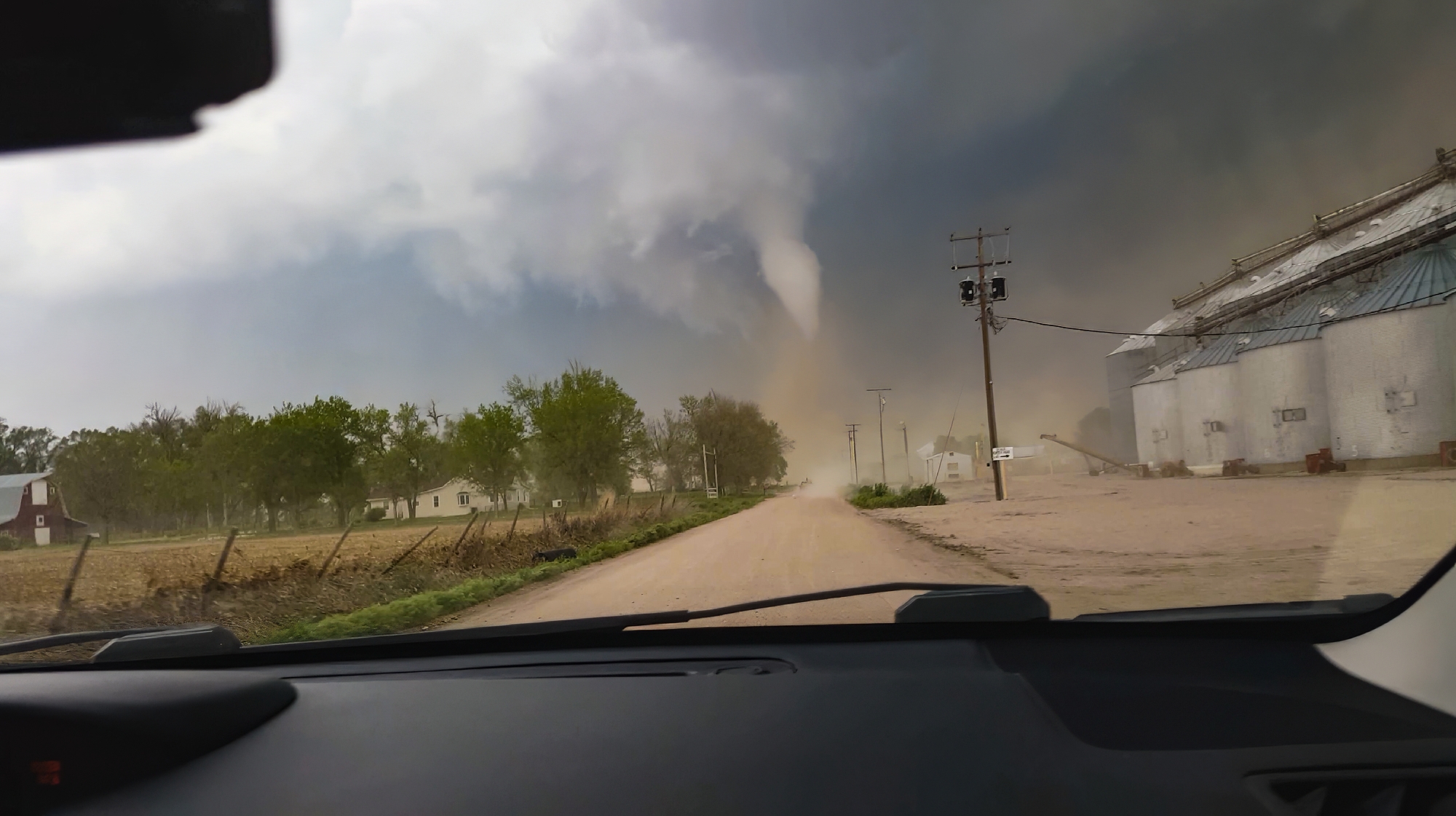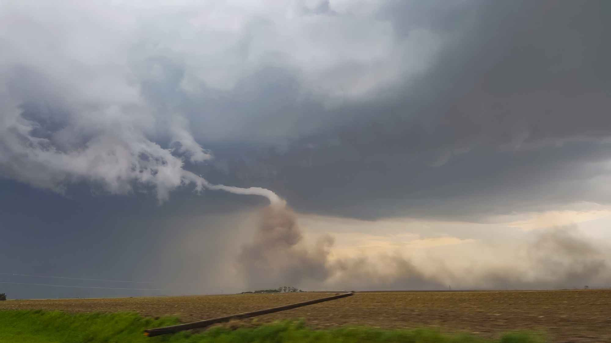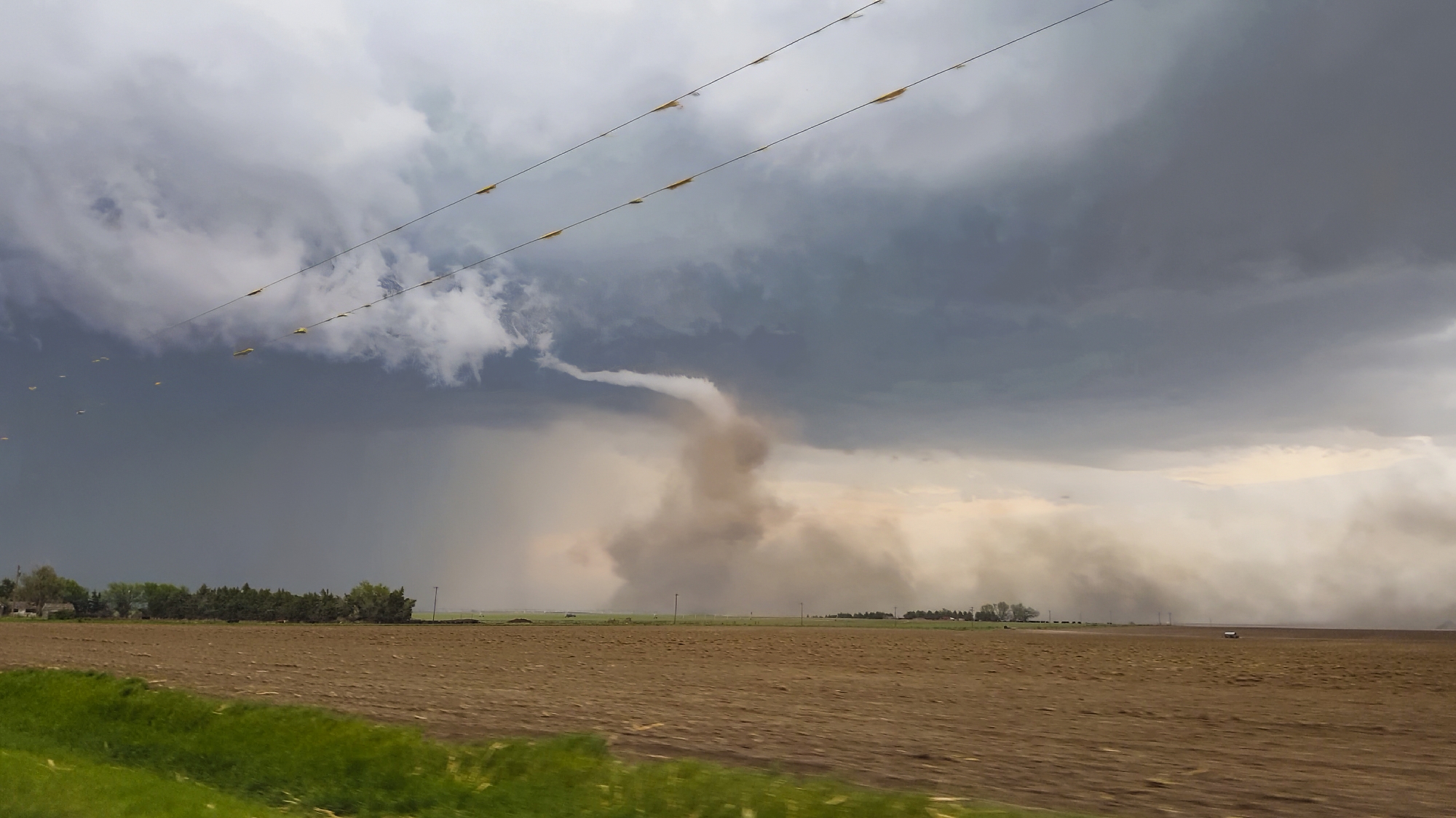 Now the task was to get as close as safely possible. At the Rd380 / US34 intersection, we bounced across the roughest railroad crossing ever. "Did we break our car??" Toni asked. But no, the pursuit was still on. RFD broadsided the Crosstrek we continued north, the elongating cone dead ahead. In all the blowing dust, scale became tricky to judge. Was the tornado only 100 yards ahead or was it still a mile up the road?? Finally, we simultaneously climbed a small hill and broke into a slightly calmer zone closer to the tornado, and it was at that moment Toni captured the picture of the day -- the fully-condensed, kinked rope with a dramatic, churning dust cloud at its base. It's one of the top views we've ever had, and in that instant, I might have shed a single tear (but it was probably from all the dust we'd just driven through).