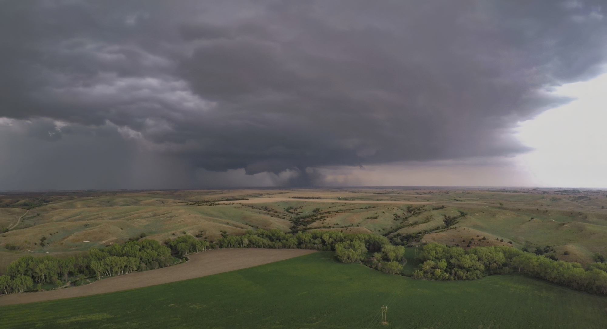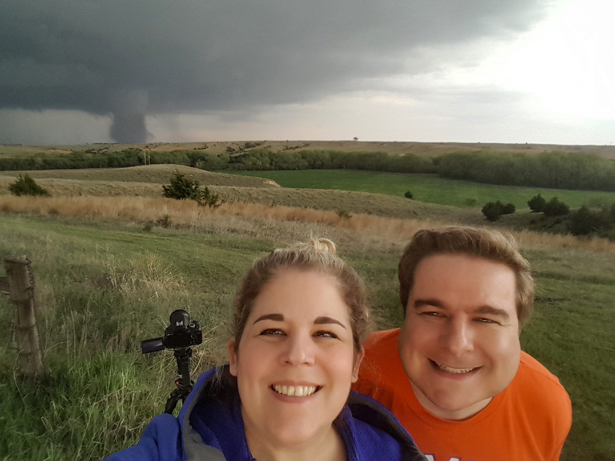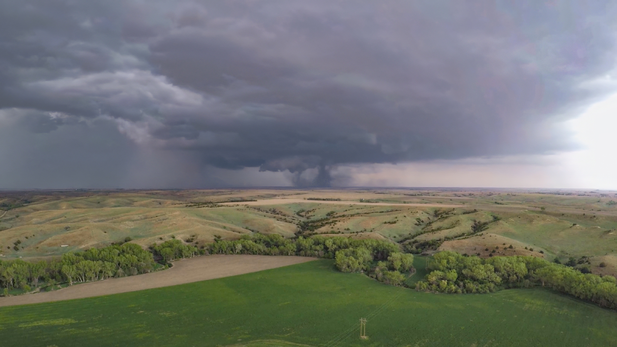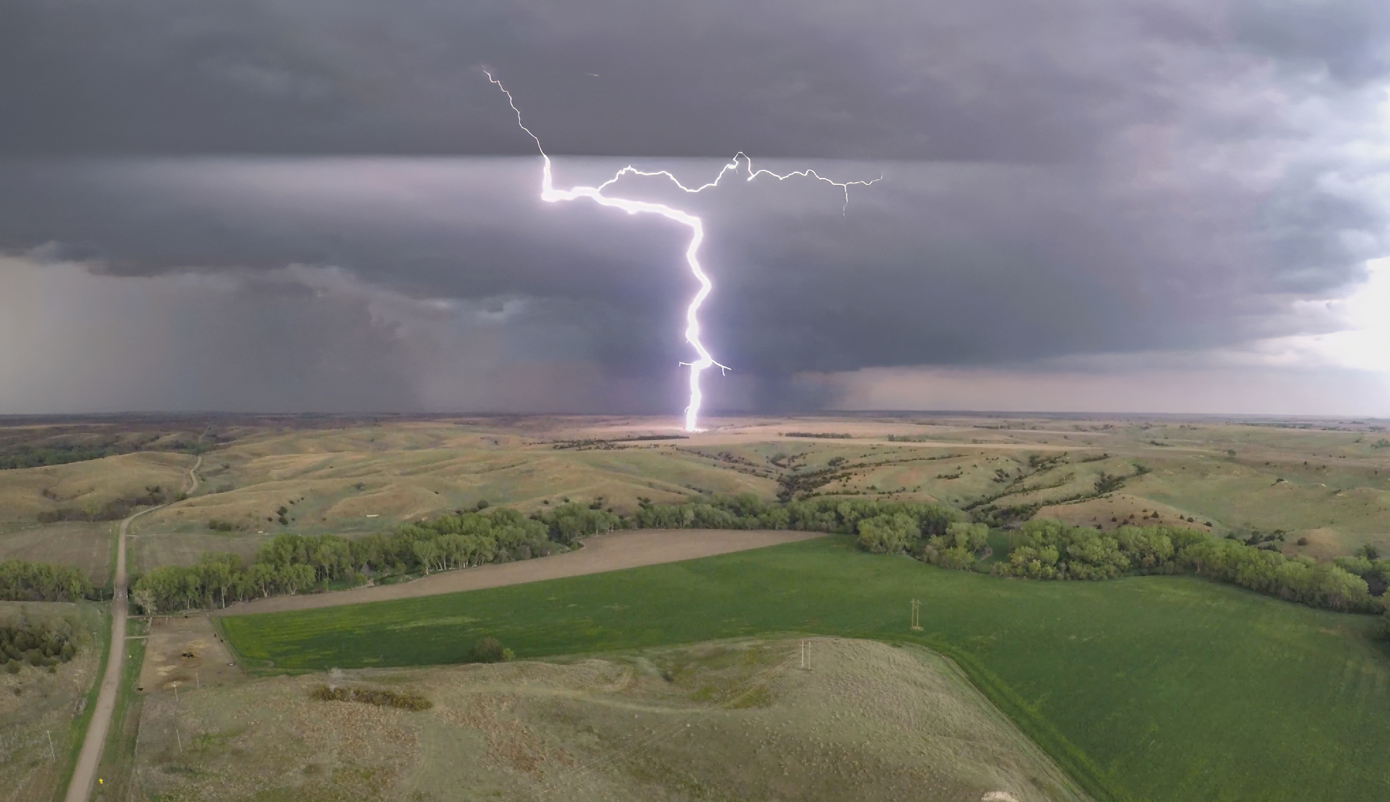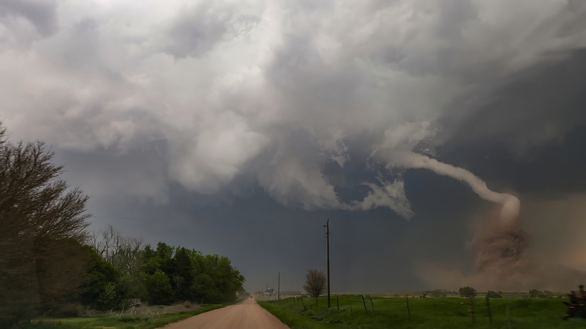 This new tornado, now officially called the Stockville EF3, dropped at exactly 7PM -- the magic hour worked its witchcraft after all. I knew we were hopelessly far behind with the road conditions, so it was an easy decision to stop and capture our first stable, tripod shots of the day -- selfies included. From our vantage about 7 miles behind the ground circulation, the dark dust created a very menacing appearance. Definitely the strongest of today's tornadoes. Another chaser pulled up beside us, but per usual we made introductions and then I promptly forgot his name. But I didn't forget to get the drone out for a flight, and was rewarded with a nice long aerial timelapse of the departing twister with parent structure. It was a nice change of pace from the hectic McCook intercept. On final inspection, the Stockville EF3 tore a path 2.1 miles long, 400 yards wide, and with peak winds around 157 MPH.