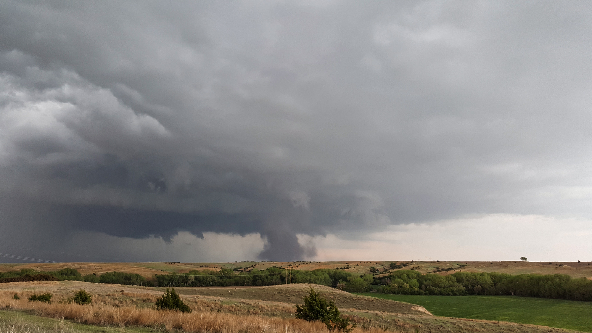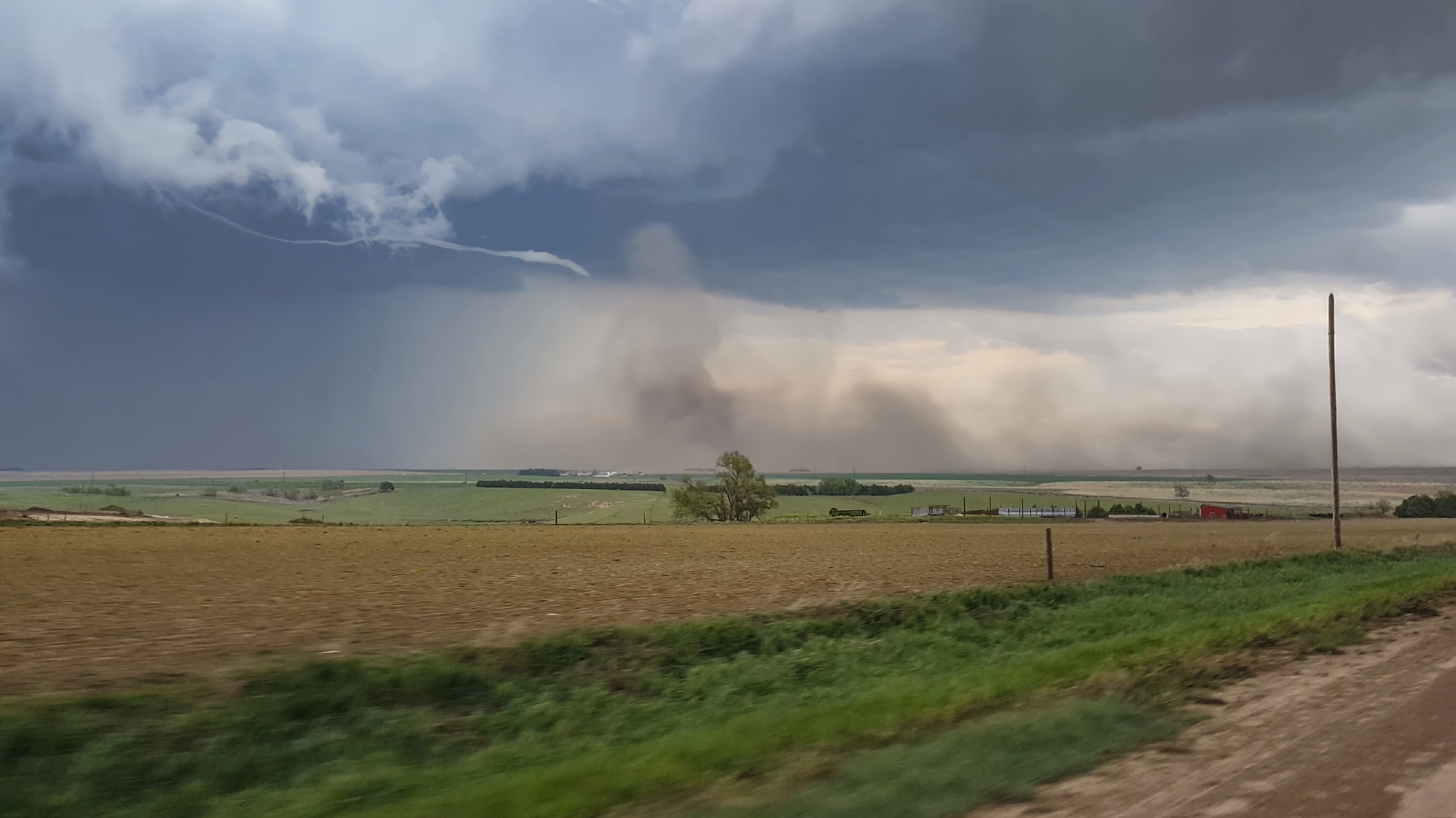 Pulling into Stockville at 6:47, our arrival was greeted by the song of our people -- a blaring tornado siren. Enjoying the ambiance for a few minutes and assessing radar, we soon ventured north of town on some very sketchy roads. I could feel the Crosstrek just begging to slide off either side of the sloping mud road. After only a mile, I chickened out; we slowly reversed course retreating from the punishing hook precip. Then suddenly, I glanced east and noticed a tornado already on the ground -- a wispy funnel with tight rising dust. I never even got a photo of this spinup before it was gone. We slowly negotiated the incredibly slick roads back towards Stockville when, after rising another hill, low and behold ANOTHER tornado was already on the ground!