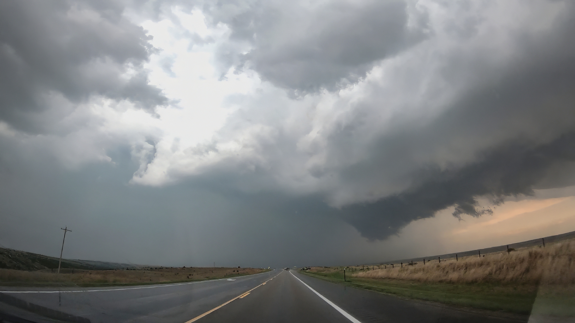 6:08 - 7:10 PM CDT: The supercell began a new cycle almost immediately, and at 6:15 we noted a new lowering to our northeast from our vantage on Hwy83. Likely if we'd hung back, we might have seen the brief tornado on this cycle, but I closed in too tight and we lost visibility in the RFD precip and hills. From there it was another 20-mile grid hop northeast as we again played keep-up with the storm. Even though we were approaching the 7-o-clock magic hour (classic for the ramping low level jet that enhances hodographs and maximizes tornado chances), our storm took on an elevated, featureless base with little promise of an imminent tor.