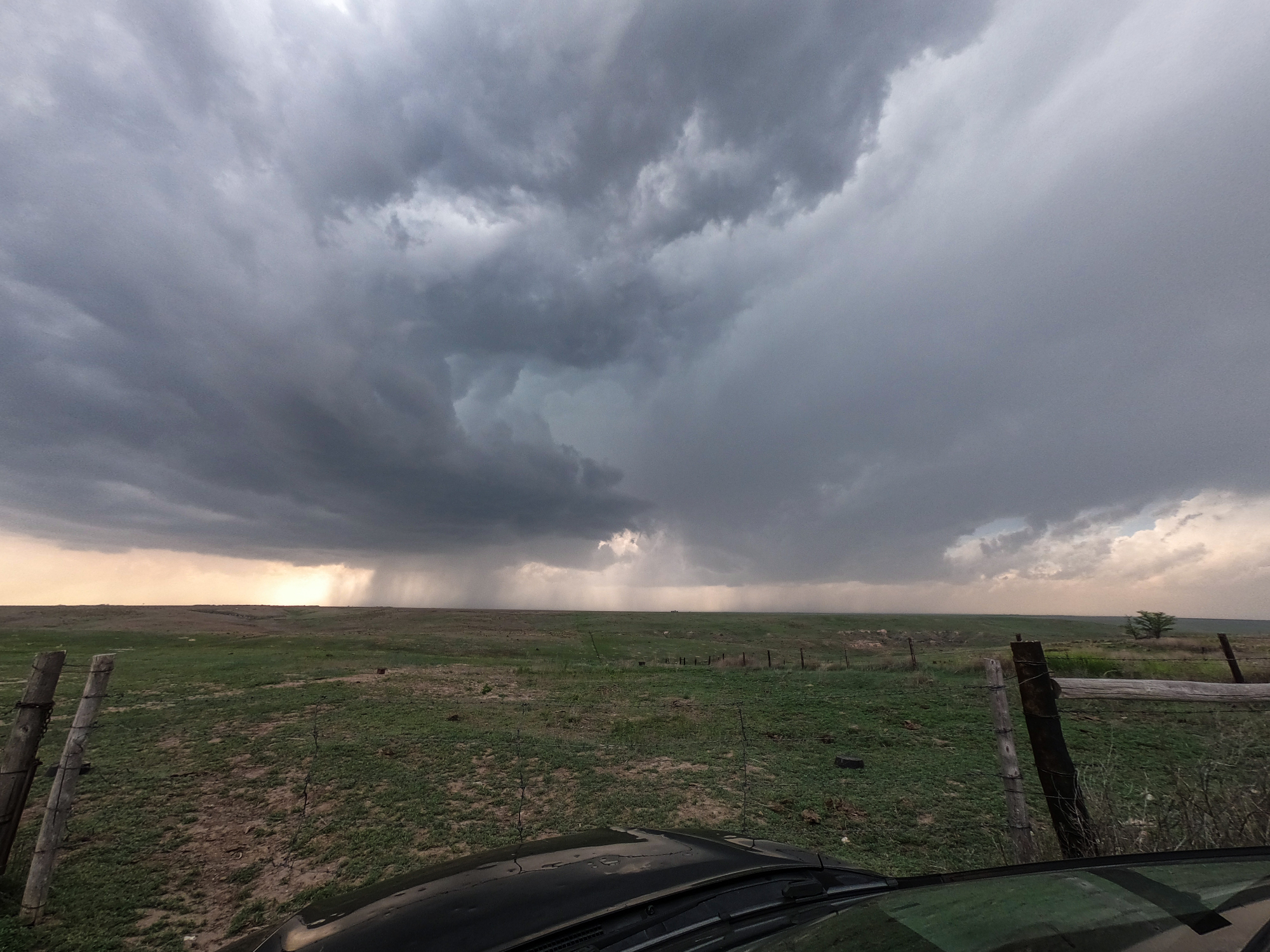 3:35 - 5:15 PM CDT: As often lamented on this blog, early storm appearance is rarely anything to write home about. But today actually held a pleasant surprise: pressing north out of Brewster, KS and getting our first look at the young severe storm, I was charmingly delighted to see a dark rain-free base and even a proto-vault in the forward flank. Stopping for the first storm lapse of the day, a couple curious horses crept up wondering what we found so interesting. And interest was indeed rising, as by 4:20 PM the first signs of a baby RFD began carving a small arc into the back of the base. Even some tentative rising scud indicated a first failed attempt at tornadogenesis. At this rate, surely we'd be seeing tornadoes within the hour, right?